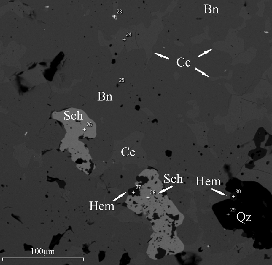 33 | 21.32 | 7.54 | – | 27.58 | – | – | – | 23.37 | 19.26 | 99.09 | Cu3.92Fe1.22Pb1.02Bi0.83S6.01 | |||
