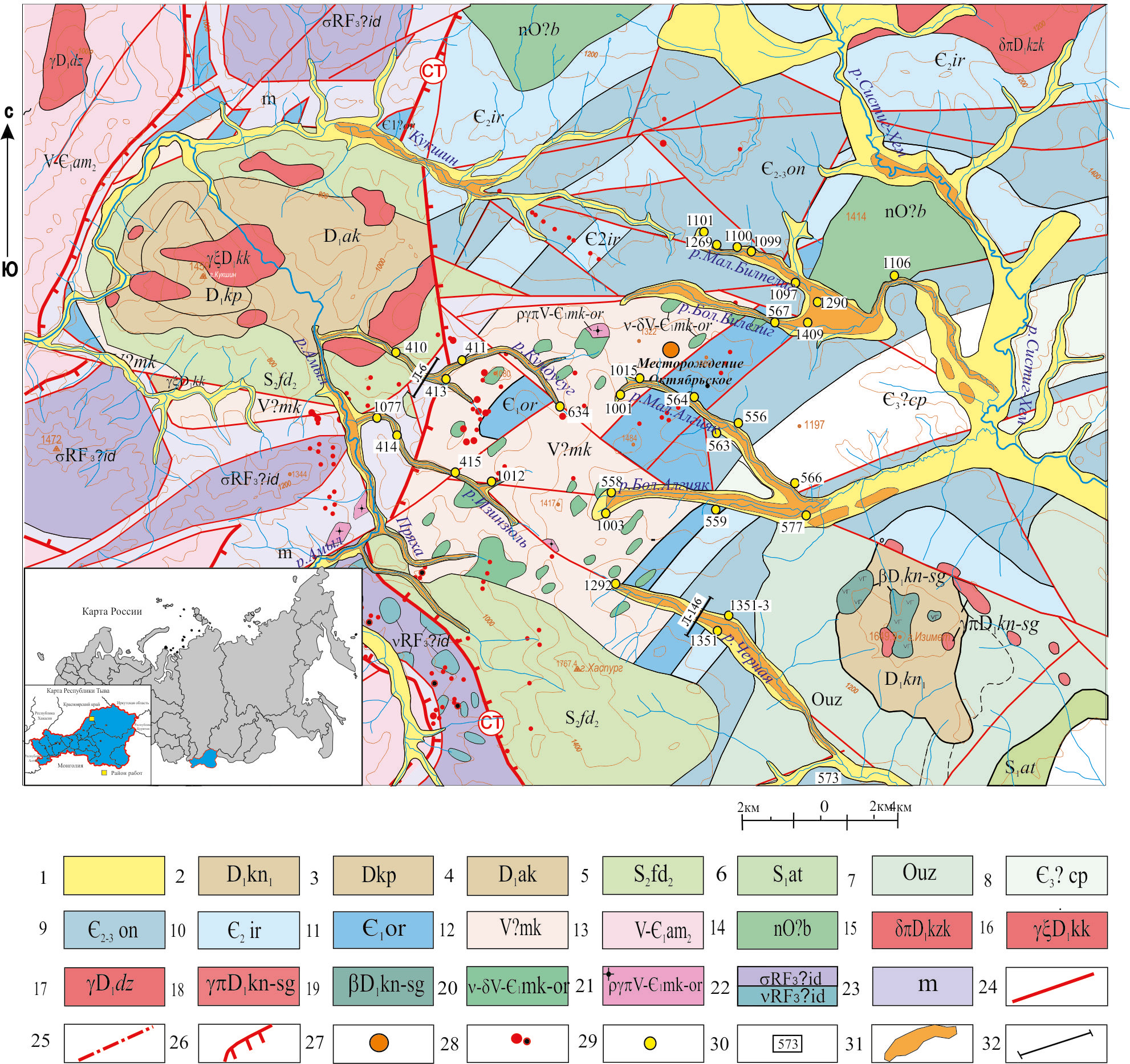 1 – Quaternary deposits; 2–4 – Lower Devonian: 2 – Kendey Formation, lower subformation, andesite, basalt; 3 – Kupkhol Formation, trachyrhyolite, trachydacite, their tuff; 4 – Akturug Formation, andesite, basalt, trachyandesite, their tuff; 5, 6 – Silurian: 5 – Fedorovsky Formation, upper subformation, conglomerate, gravelite, sandstone, siltstone; 6 – Atchol Formation, sandstone, red siltstone; 7 – Ordovician (Sistigkhem Group), Uza Formation, sandstone, conglomerate, gravelite; 8–11 – Cambrian: 8 – Chapshi Formation, rhythmic intercalation of conglomerate, sandstone, and siltstone; 9 – Onchan Formation, siltstone, claystone, silty sandstone, lenses of gravelite and limestone; 10 – Irgitkhem Formation, agglomerate tuff, conglomerate, sandstone, gravelite, limestone lenses, 11 – Oreshsky Formation, clayey-siliceous and carbonaceous-siliceous shales, horizons of quartzite, basalt, their tuff, limestone (>1280 m); 12, 13 – Vendian: 12 – Makarovsky Formation, metabasalt, their tuff, siliceous-clayey shale, limestone lenses; 13 – Amyl Formation, sericite-chlorite-albite-quartz schist, lenses of marble, metabasalt; 14–22 – intrusive rocks: 14 – Sistigkhem Subzone, Bulka layered anorthosite-gabbro complex, anorthosite, gabbro, norite, gabbronorite, troctolite, pyroxenite; 15 – Kyzykchadr gabbronoritic complex, diorite, quartz diorite, gabbro, gabbrodiorite; 16 – Kurtushibinsky ophiolite belt, Kukshin syenite-alkali granitic complex, granosyenites; 17 – Dzhebash-Amyl Subzone, Dzhoy granitic complex, alkali granite; 18 – Kendey-Sagly basalt-rhyolitic complex, granite porphyry, rhyolite; 19 – basalt, microgabbro; 20 – Makarovsky-Oreshsky basaltic-andesitic-rhyolitic complex, microgabbro, dolerite; 21 – plagiogranite, porphyry; 22 – Idzhim gabbro-ultramafic complex, ultramafic zone (σ): harzburgite, dunite, serpentinite, serpentinized rocks, gabbroic zone (ν): gabbro, gabbronorite, microgabbro dikes, dolerite, basalt; 23 – tectonic mélange; 24, 25 – faults: 24 – proven; 25 – inferred; 26 – thrusts; 27 – Oktyabr’skoe deposit (94°35′30′′ E, 53°05′ N); 28 – points of gold mineralization; 29 – observation points (o. p.); 30 – sample numbers; 31 – placers; 32 – position of geological cross-sections.