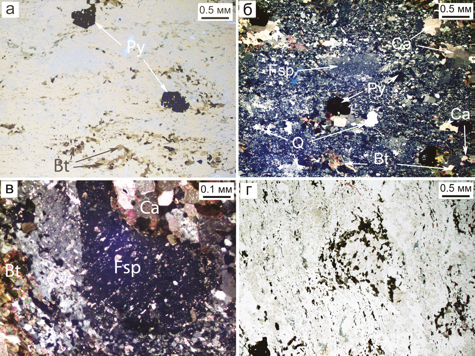 Fig. 2. Feldspar-mica-quartz schist: a – lenticular-banded texture emphasized by inclusions of biotite (Bt) and pyrite (Py); б, в – lepidogranoblastic structure of the matrix: porphyroblast of orthoclase (Fsp) with carbonate (Ca), mica, quartz (Q) and pyrite; г – thin dissemination of ore minerals and biotite in a structure reflecting pressure-related rotation. Polarized light.