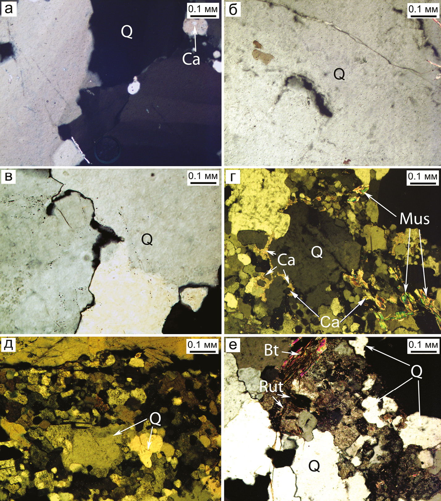Рис. 4. Кварцевый агрегат прожилка: а – кварцевые зерна (Q) с волнистым погасанием и зубчатой границей; б – щелевидные пустоты растворения в кварце; в – растворение зерен на границе и тени растворения в зернах; г – новообразованные мусковит (Mus) и кальцит (Ca) в кварцевом прожилке; д – милонитизированный кварцевый агрегат с зернами новообразованного кварца и рудным веществом (черное); е – трещины в кварце, залеченные биотитом (Bt), пиритом и рутилом (Rut). Поляризационный свет.