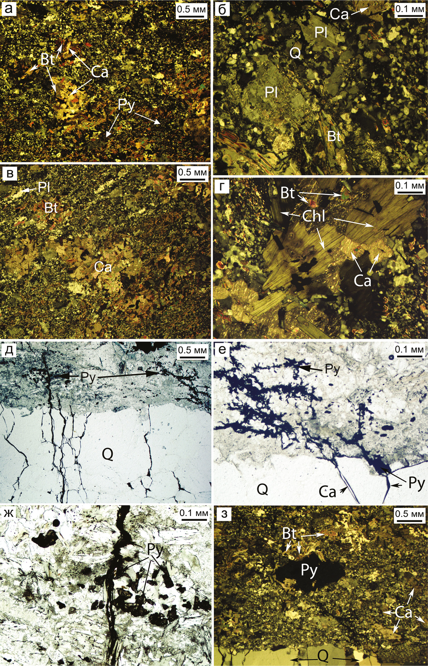 Рис. 5. Полевошпат-хлорит-слюдисто-кварцевый сланец: а – лепидогранобластовый матрикс с биотит (Bt)-карбонатными (Ca) и кварц (Q)-биотитовыми агрегатами и пиритом (Py); б – деформированные карбонатизированные порфиробласты плагиоклаза (Pl) среди кварца и слюды; в – скопления карбоната (Ca) и биотита в матриксе с элементами сланцеватой текстуры; г – пластинки хлорита (Chl) с плеохроичными двориками в ассоциации с кальцитом (Ca) и слюдой; д, е – деформированный кварцевый прожилок на контакте с вмещающей породой; ж, з – рудная жилка и вкрапленность пирита в биотит-карбонат-хлоритовом агрегате вмещающей породы. Поляризационный свет.