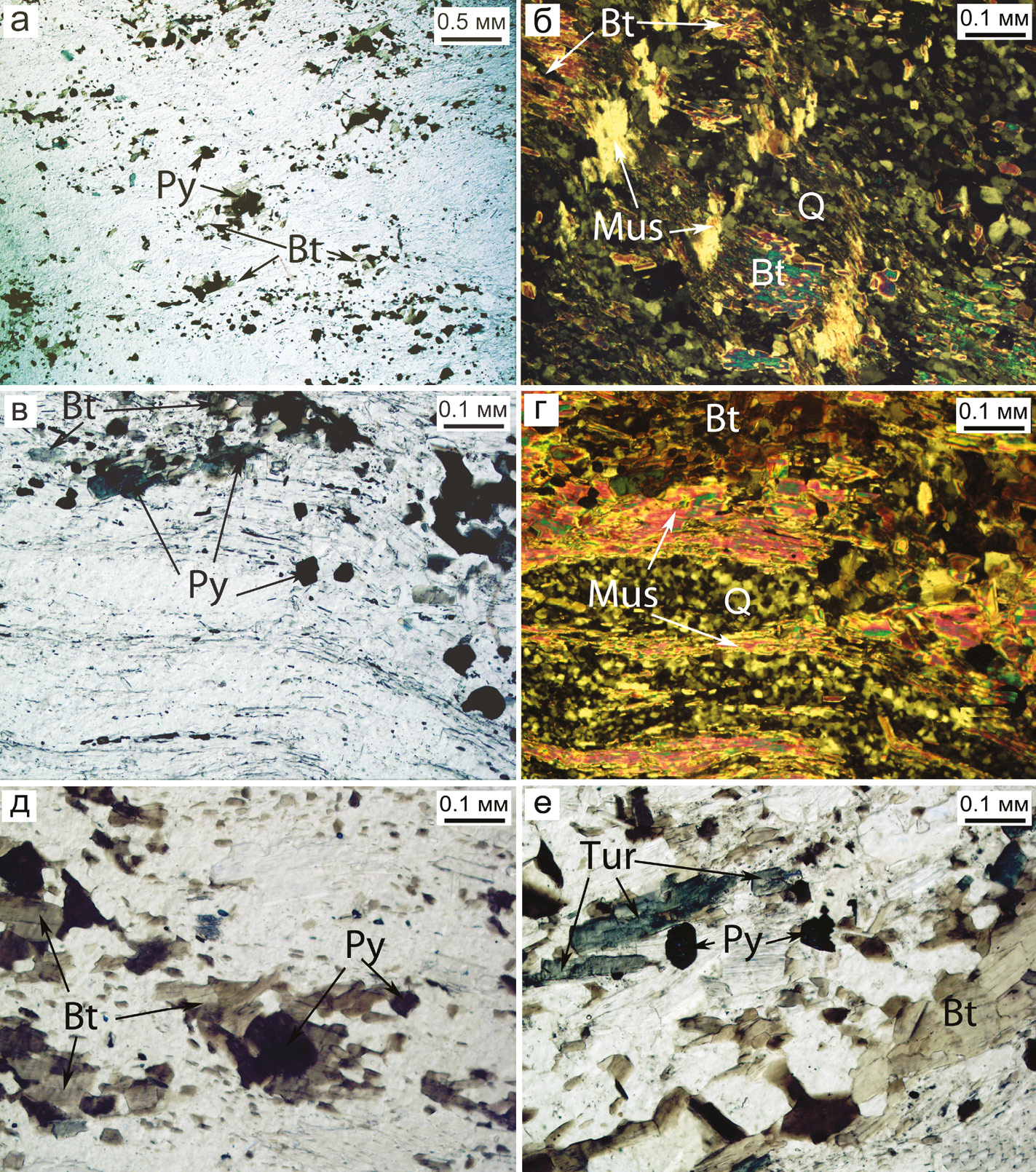 Рис. 6. Кварцево-слюдистый сланец: а, б – полосчато-плойчатая текстура и лепидогранобластовая и микрогранобластовая структура породы: включения пирита (Py) и биотита (Bt) и смятые пластинки слюды в основной массе (Mus); в, г – полосчатая текстура и лепидогранобластовая и микрогранобластовая структура породы с рудной вкрапленностью, приуроченной к биотитовым слоям; д – существенно серицитовый прослой с линзами биотита и приуроченной к ним рудной вкрапленностью; е – деформированные слои с биотитом, турмалином (Tur) и пиритом. Поляризационный свет.