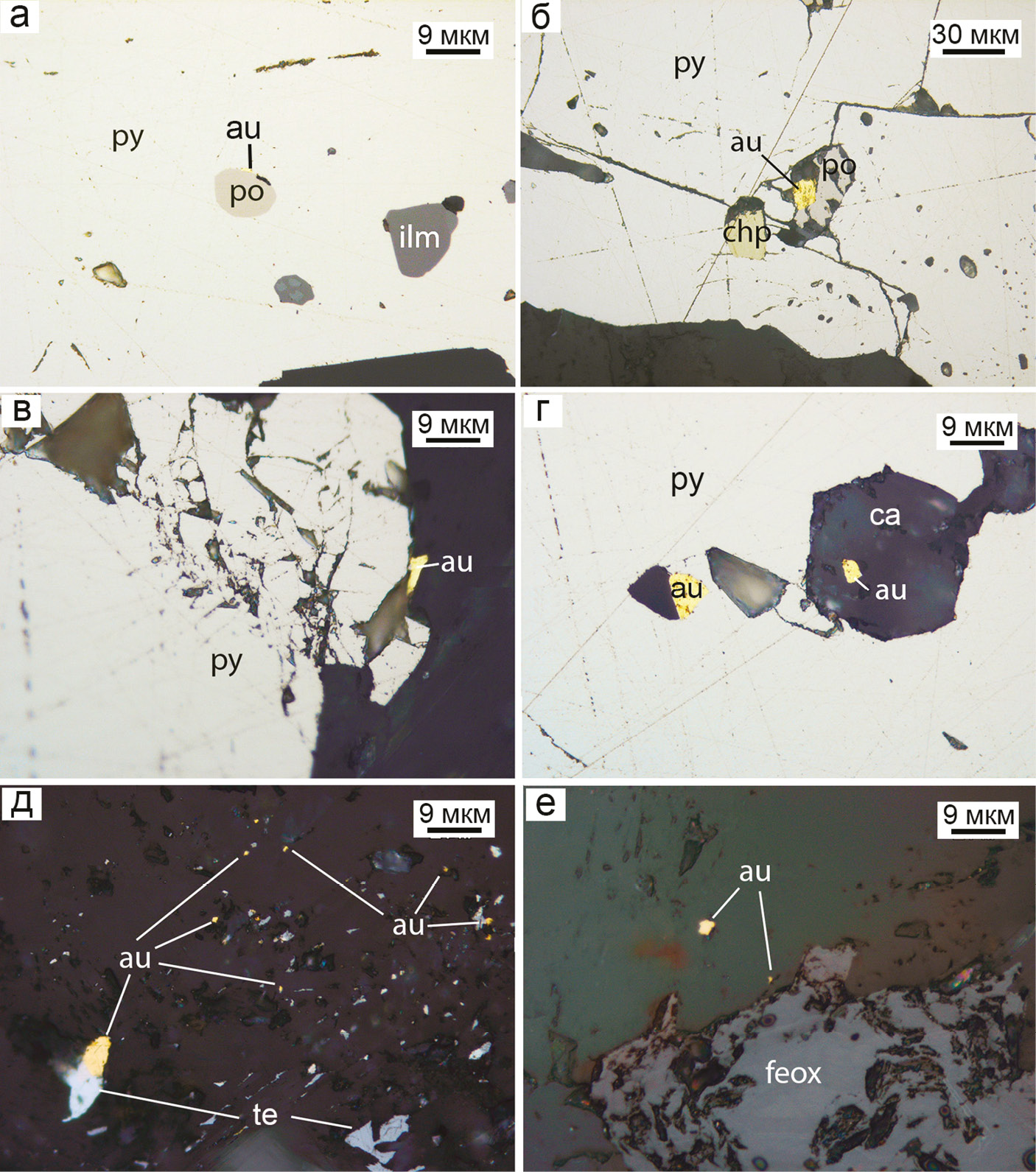 Fig. 8. Relationships of native gold, sulfides and gangue minerals in ores of the Osinovskое deposit: a, б – native gold (au) in assemblage with pyrrhotite (po) inclusions in pyrite (py), which also contains ilmenite (ilm) (a) and chalcopyrite (chp) (б) inclusions; в – angular native gold grain at the contact between fractured pyrite and rock matrix; г – native gold grains in assemblage with ankerite (ca) in pyrite; д, е – native gold in assemblage with gangue minerals: numerous inclusions of native gold grains and tellurides (te) in chlorite-micaceous matrix (д) and in assemblage with iron hydroxides (feox) (e). Reflected light.