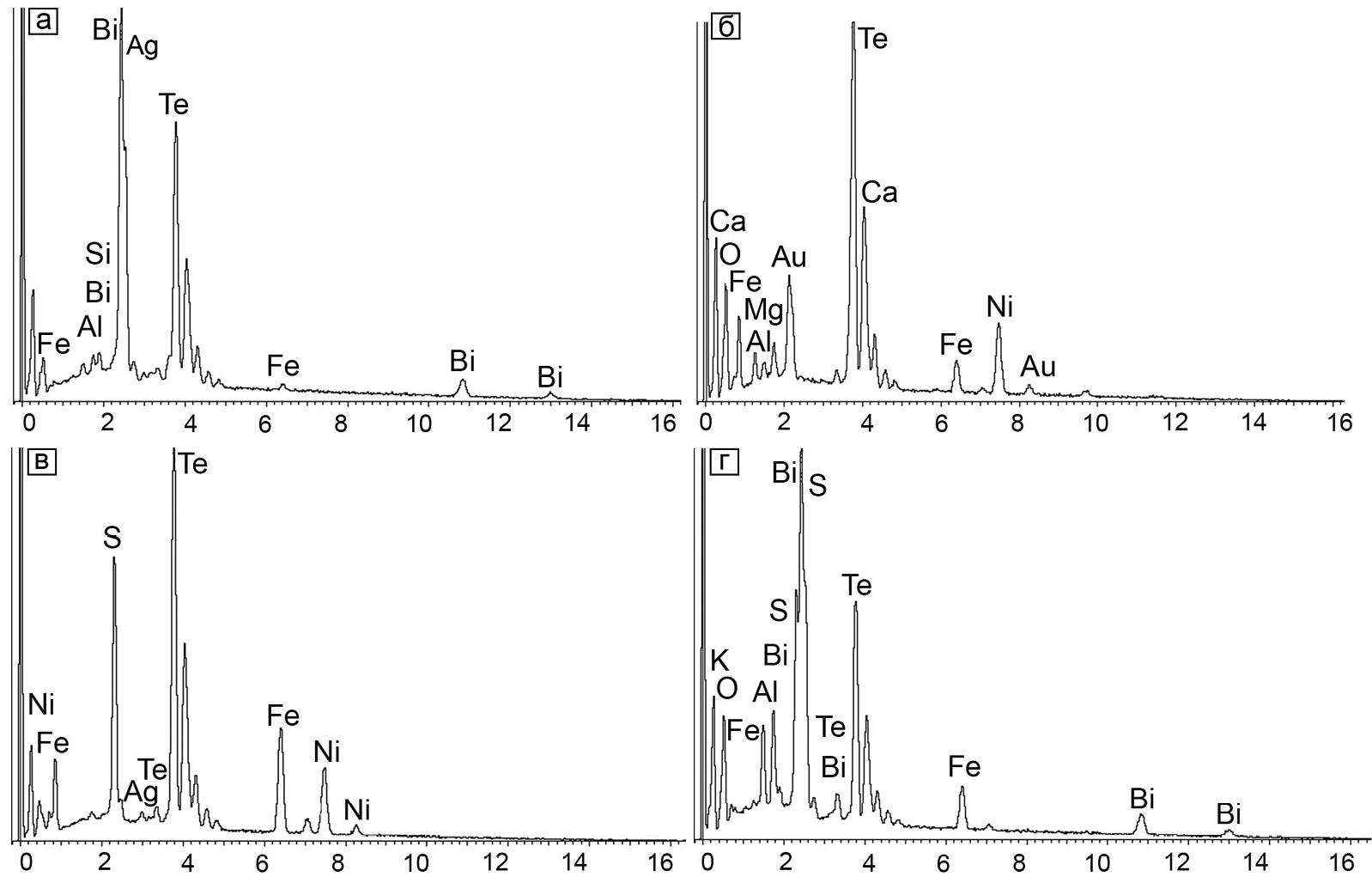 Fig. 10. Energy-dispersive spectra of volynskite in gangue minerals (а), melonite in gangue minerals (б) and pyrite (в), and a Bi-Te-S mineral (г) in gangue minerals.