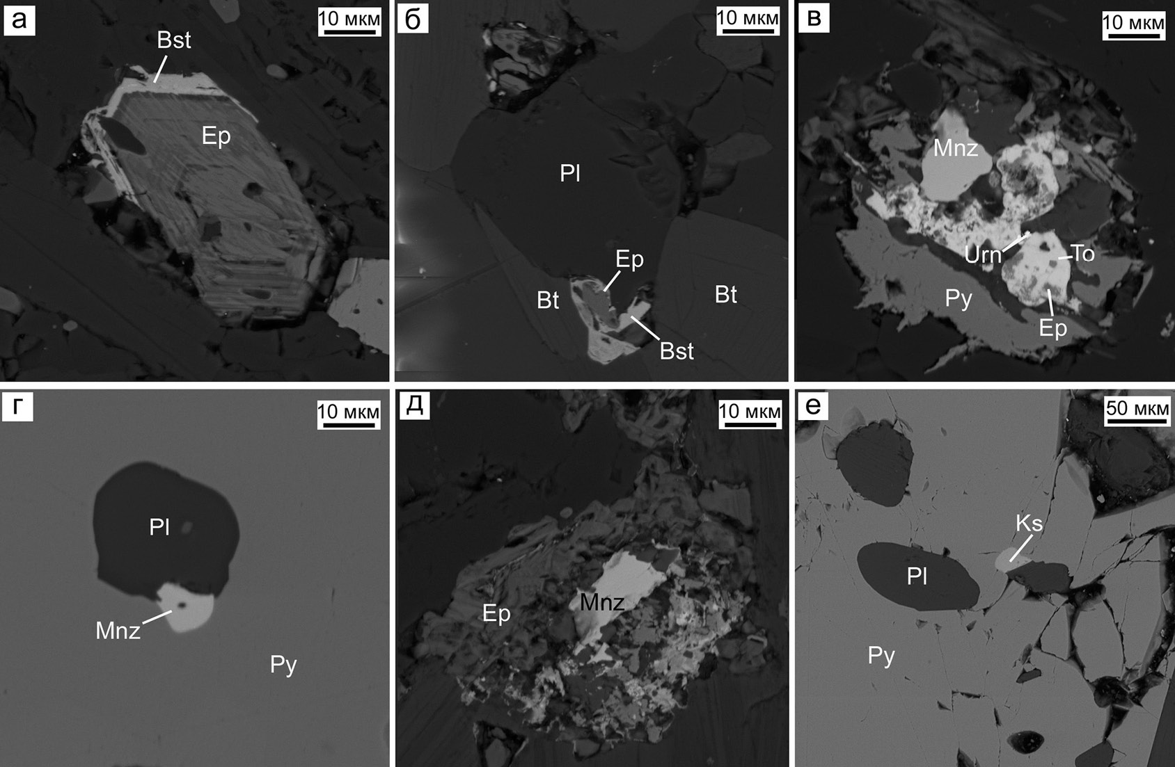 Fig. 11. Th-U-REE mineralization in host rocks of the Osinovskoe deposit: a – epidote crystal (Ep) with a hydroxylbasnäsite-(Сe) rim (Bst); б – intergrowths of epidote and hydroxylbasnäsite-(Ce) between plagioclase (Pl) and biotite (Bt) crystals; в – REE minerals (Mnz) and REE-bearing minerals (Urn, To) surrounded by epidote, pyrite (Py) and chlorite (black); г – monazite-(Ce) inclusion intergrown with plagioclase in pyrite; д – monazite-(Ce) and epidote intergrowth surrounded by mica and chlorite; e – xenotime-(Y) (Ks) inclusion in pyrite. BSE photo.