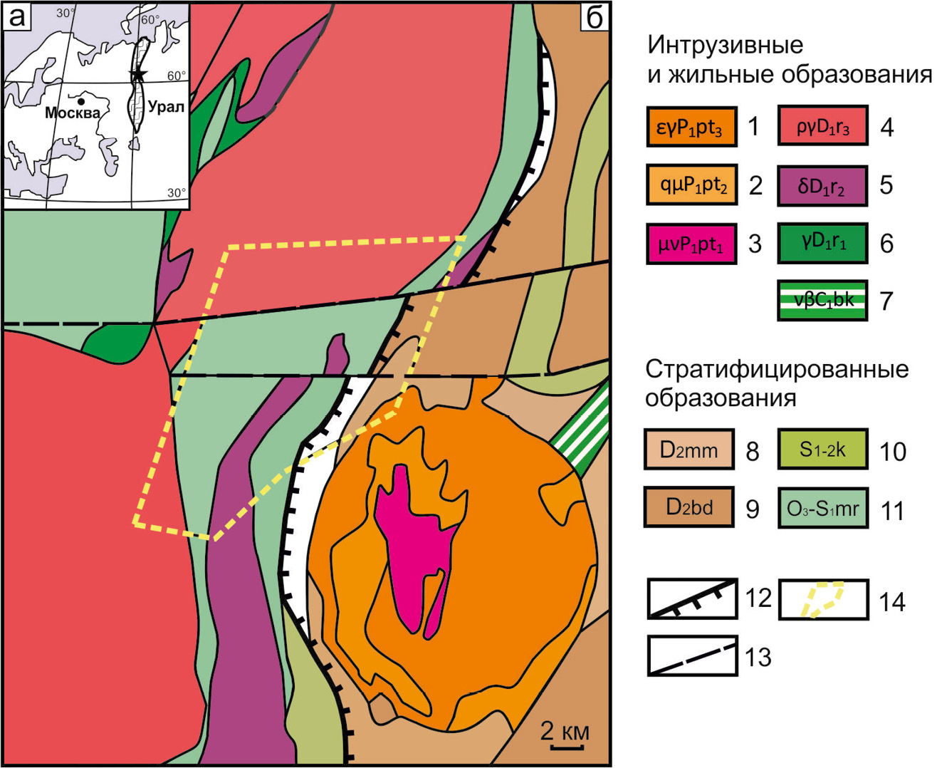 Fig. 1. Position of the licensed area on geographical scheme (a) and geological map on a scale of 1 : 200 000 (б) (Korovko et al., 2015). 1–3 – Petukhovsky monzonite-granite complex: 1 – granite, leucogranite; 2 – quartz monzonite, syenite, quartz syenite; 3 – monzogabbro, monzonite; 4–6 – Reftinsky gabbro-diorite-plagiogranite complex: 4 – plagiogranite, tonalite; 5 – diorite, quartz diorite; 6 – gabbro; 7 – dikes of gabbrodolerite and dolerite; 8 – basalt, basaltic andesite, andesite, dacite, sandstone, siltstone with limestone horizons of the Maminskaya Sequence; 9 – basaltic-dacitic sequence; 10 – mica-quartz, graphite-, garnet- and staurolite-bearing, and amphibole-feldspar schist, quartzite schist, marl of the Kolyutkino Sequence; 11 – epidote-amphibole, amphibole-plagioclase, and biotite-sericite-plagioclase-quartz schist, Maloreftinsky Sequence; 12 – Zlatogorovsky Thrust, 13 – thrusts; 14 – boundaries of the licensed area.