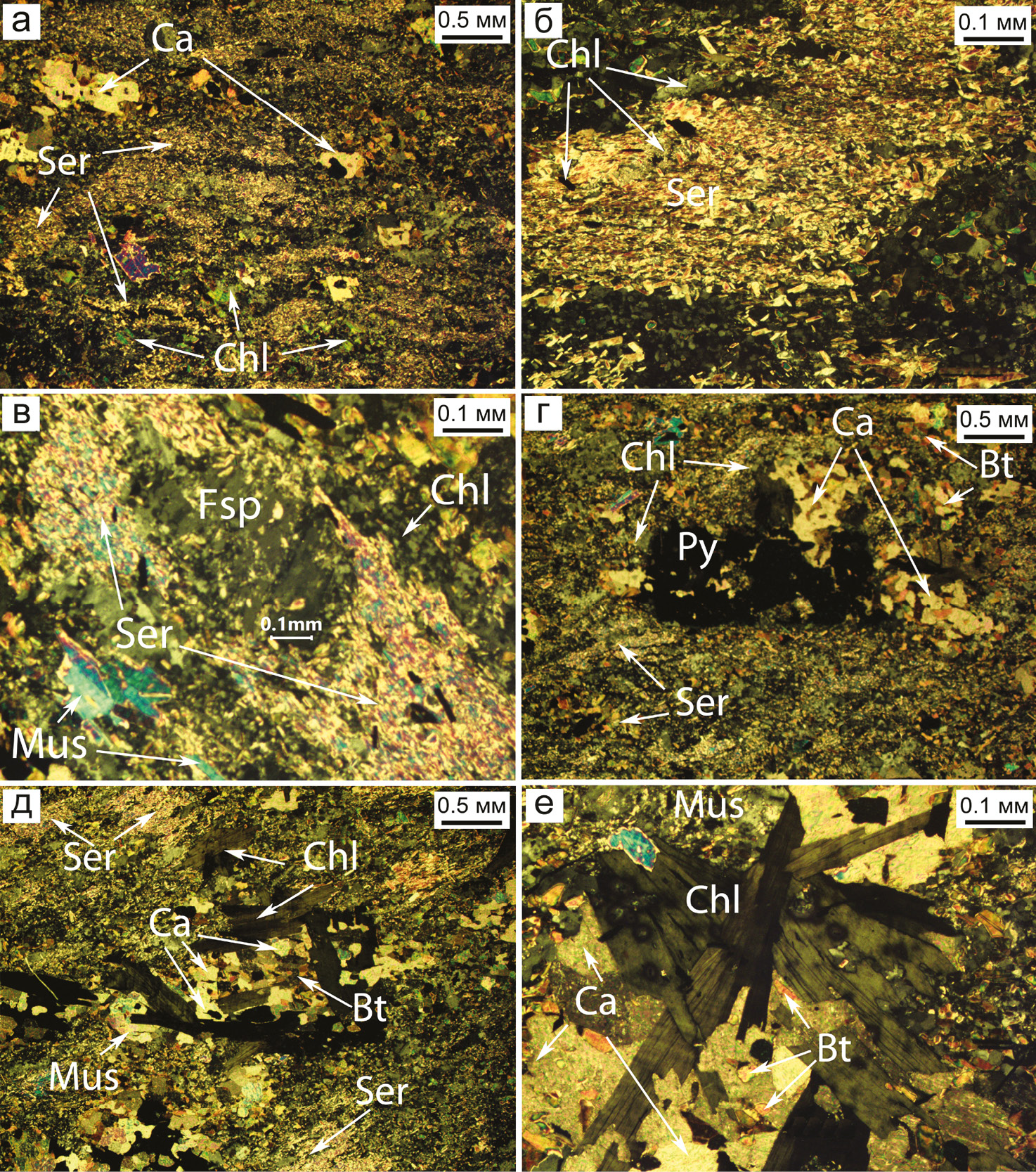 Рис. 3. Кварц-хлорит-слюдистый сланец: а – полосчатая текстура породы с линзовидными кварц-серицитовыми (Ser) агрегатами и пятнами карбоната (Ca) и хлорита (Chl); б – линзовидный агрегат серицита с лепидогранобластовой структурой; в – слюдисто-хлоритовый агрегат с реликтовым ортоклазом (Fsp) в центре; г – вкрапленность рудных минералов (Py) в хлорит-биотит-кальцитовой линзе; д – кварц-биотит-кальцитовый агрегат с хлоритовой каймой в слюдистой массе; е – сростки сдвойникованного клинохлора в ассоциации с кальцитом, содержащим мелкие пластинки биотита (Bt). Поляризационный свет.