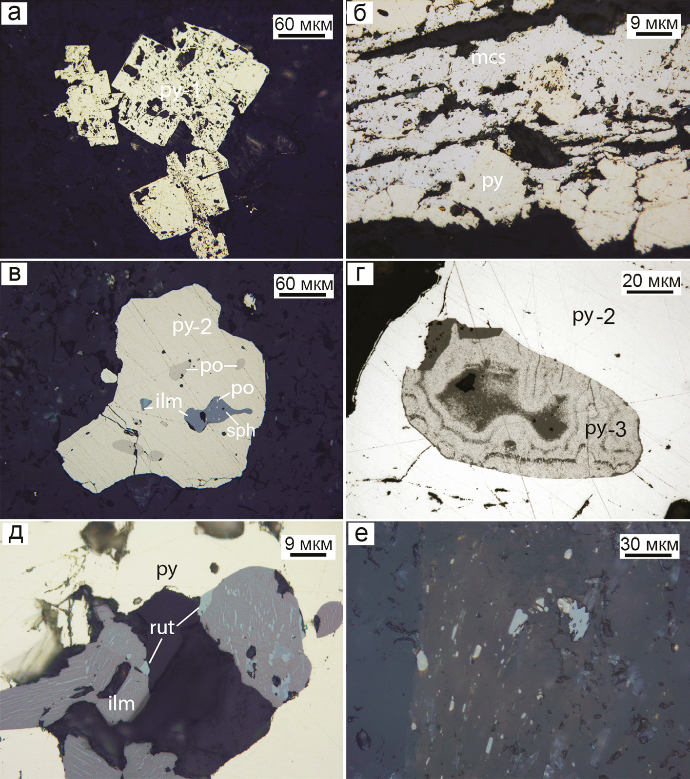 Fig. 7. Morphology and assemblages of major ore minerals in ores of the Osinovskое deposit: a – subhedral porous pyrite-1 crystals (py-1); б – intergrowths of marcasite (mcs) and pyrite (py); в – isometric grains of pyrite-2 (py-2) with inclusions of pyrrhotite (po) and ilmenite (ilm), sphalerite (sph) also with pyrrhotite inclusions; г – rounded inclusion of finely dispersed pyrite-3 (py-3) in pyrite-2 crystal; д – ilmenite with rutile ingrowths (rut) in pyrite; e – oriented dissemination of rutile in matrix. Reflected light.