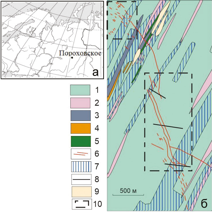 Fig. 1. Geographical position of the Porokhovskoe deposit (a) and scheme of geological structure of the deposit (Chistyakov, 1964, modified by UGE Company) (б). 1 – tuff of porphyrites; 2 – pyroxene-plagioclase porphyrite; 3 – marble; 4 – epidosite, epidote-chlorite, epidote-actinolite rocks; 5 – skarn; 6 – karst cavities; 7 – W-bearing quartz and quartz-muscovite veins; 8 – epidotization zones; 9 – faults; 10 – boundaries of areas.