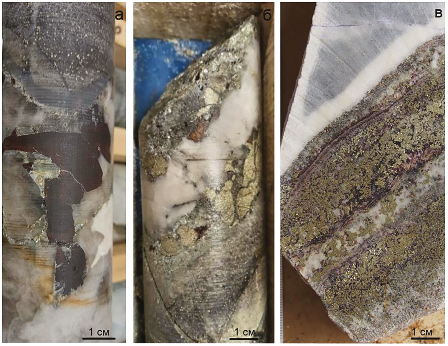 Fig. 2. Main types of ore veins: a – coarse-crystalline hübnerite in muscovite-quartz vein (sample 2041A/130.1); б – sulfide-enriched carbonate-fluorite-quartz vein (sample 2051/49.6); в – fluorite-pyrite vein in marble (sample 2013/129.6).