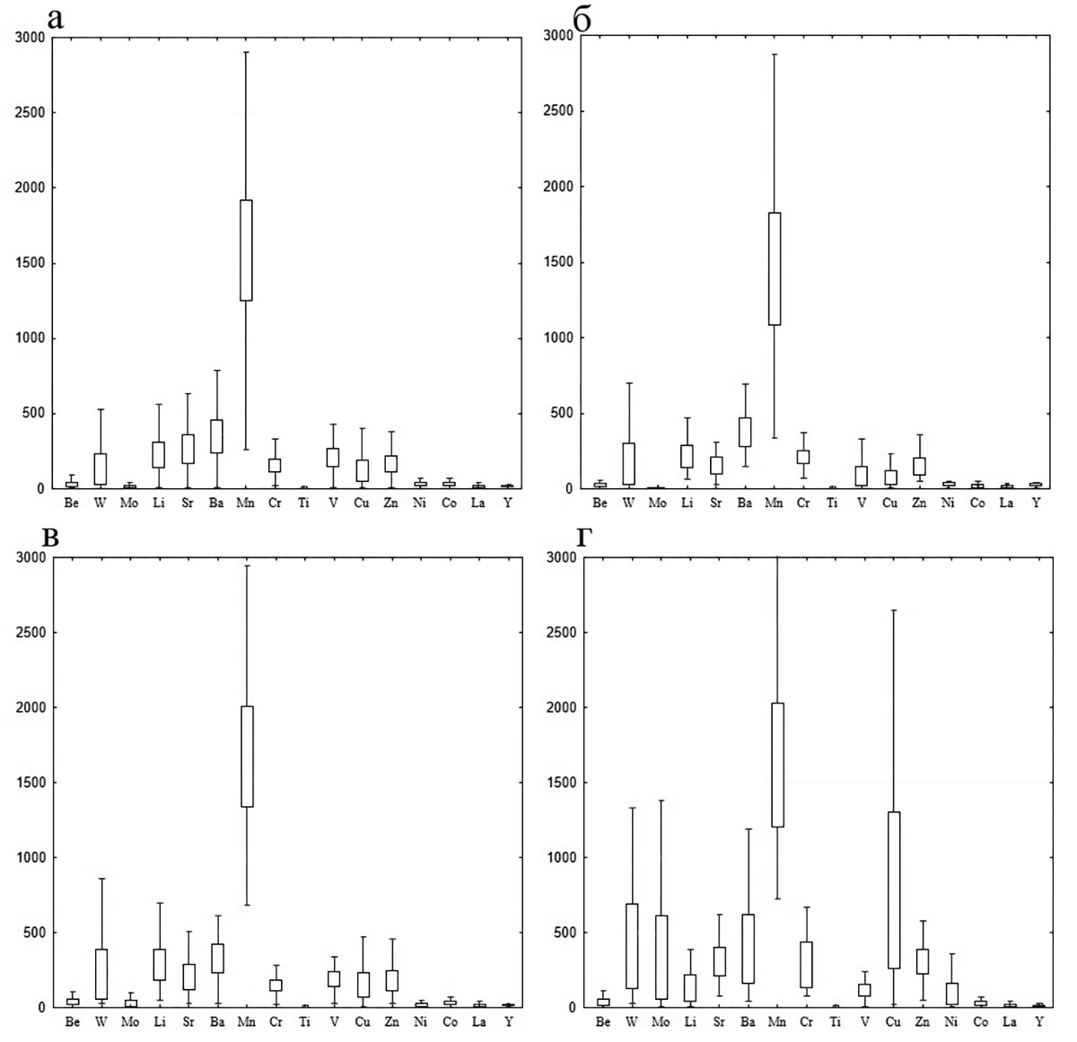 Fig. 3. Variations in contents of chemical elements in host rocks of the Porokhovskoe deposit: a – andesite and andesitic tuff; б – shale; в – metasomatite; г – skarns. The boundaries of boxes are the first and third quartiles and the whiskers show a range of contents.