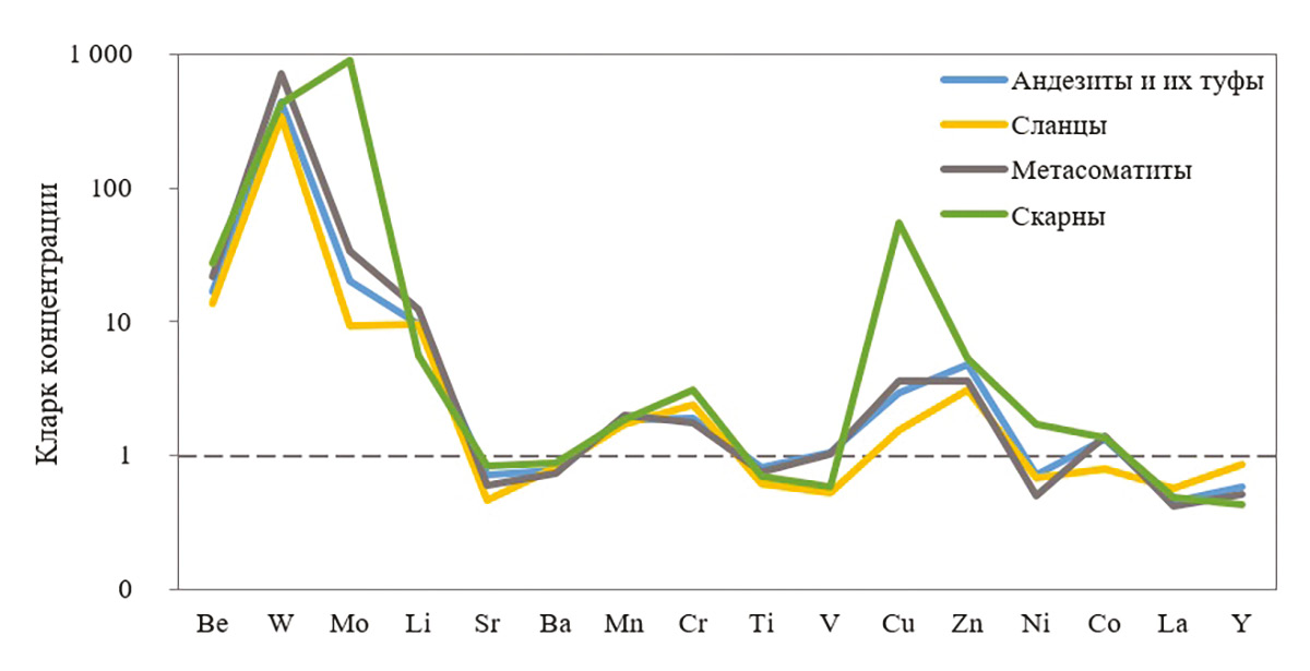 Из анализа кларков концентраций и характера распределения элементов во всех типах вмещающих породах можно сделать вывод об их близкой геохимической специализации на W и Mo и, в меньшей степени, на Be, Cu, Li и Zn. Для всех пород характерны содержания Ti, V, Sr, Ba, Ni, La и Y ниже кларковых. Повышенные концентрации W характерны для метасоматитов, а Be и Mo – для скарнов. Такие геохимические черты характерны для месторождений связанных с лейкократовыми гранитами, специализированных на Be-W-Mo (Метасоматизм..., 1998).