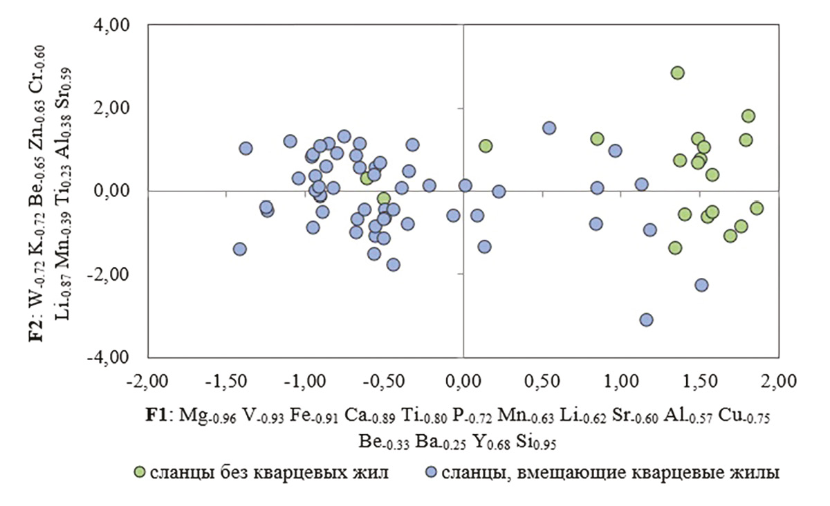 По фактору 1 наблюдается разделение сланцев на таковые с богатой жильной рудной минерализацией в области отрицательных значений фактора и сланцы, бедные жилами, в области положительных значений фактора. По значениям фактора 2 сланцы явно не разделяются. В области положительных значений фактора 1 находятся сланцы, не содержащие рудных кварцевых жил (рис. 8). По значениям фактора 2 сланцы с потенциально рудными жилами и пустые не отличаются.