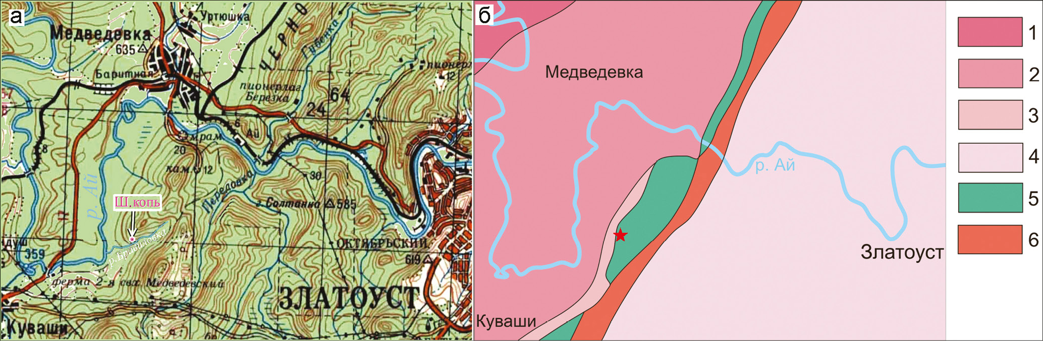 Рис. 1. Географическое положение Шишимской копи в районе города Златоуста (указано стрелкой) (а) и геологическая схема строения района копи (б).