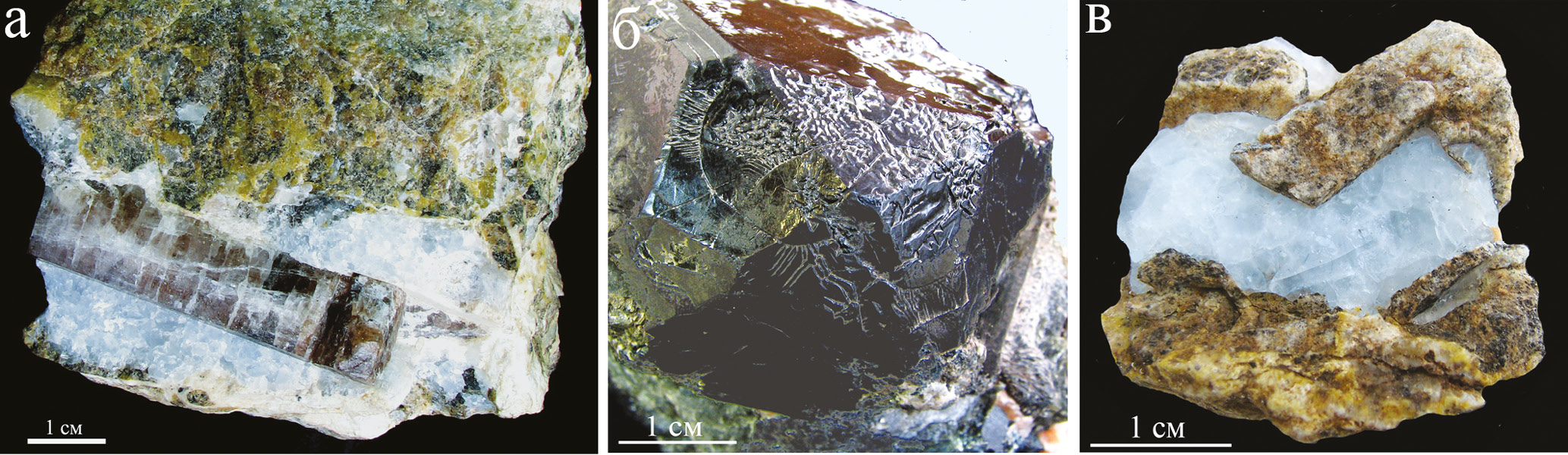 Рис. 5. Крупные кристаллы апатита (а), шпинели (б) и монтичеллита (в) в кальцитовых карбонатит-пегматитах Шишимской копи.