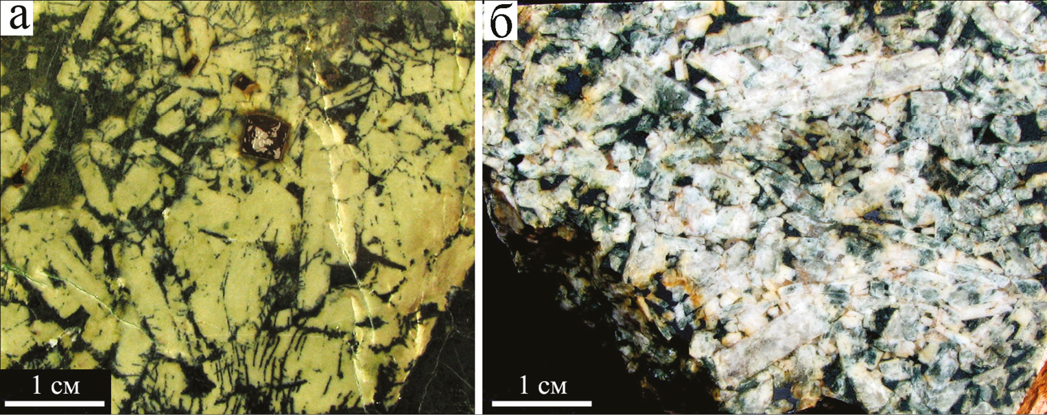 Fig. 7. Coarse-grained gabbro with skarn assemblages: a – epidotized with pyrite metacrystals (limonite pseudomorphoses); б – variously chloritized.