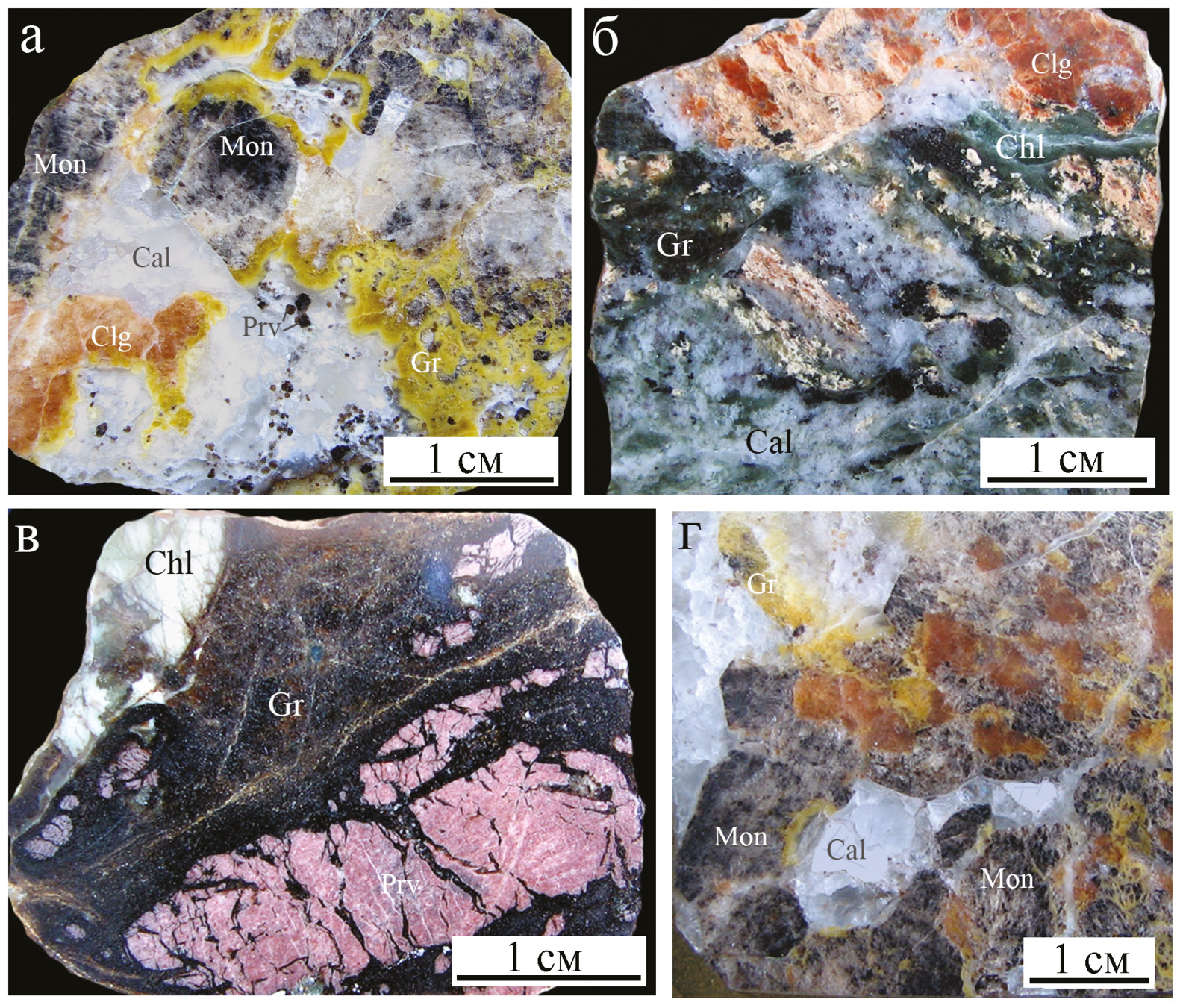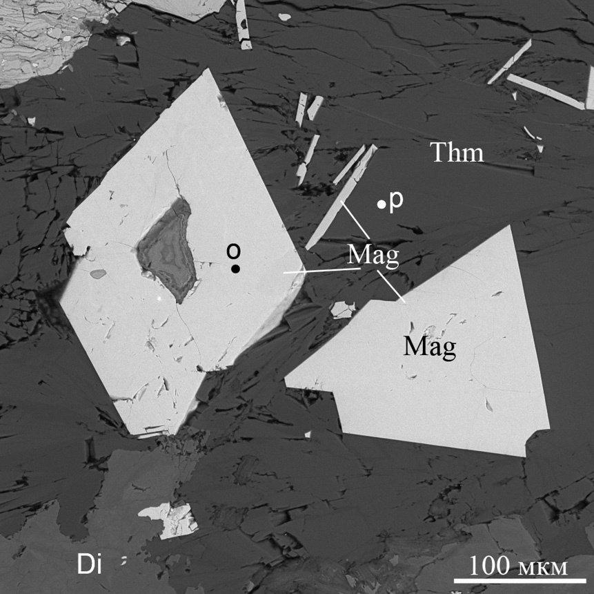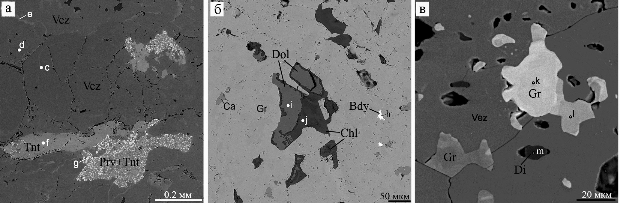 На рисунках использованы следующие аббревиатуры: Aln – алланит-(Ce), Amf – амфибол, And – андрадит, Ap – апатит, Bdy – бадделеит, Brc – брусит, Brt – барит, Ca, Cal – кальцит, Chl – хлорит, Chu – клиногумит, Clg – гидроксилклиногумит, Czt, Clz – кальциртит, Di – диопсид, Ep – эпидот, Gk – гейкилит, Gr – гроссуляр, Ilm – ильменит, Mag, Mgt – магнетит, Mon – монтичеллит, Prv – перовскит, Rt – рутил, Srp – серпентин, Tau – таумасит, Thm – томсонит-Са, Ti-Mgt – титаномагнетит, Tr – тремолит, Ttn, Tnt – титанит, Val –валлериит, Vez – везувиан, Zr – циркон, Zrl, Zrn – цирконолит.