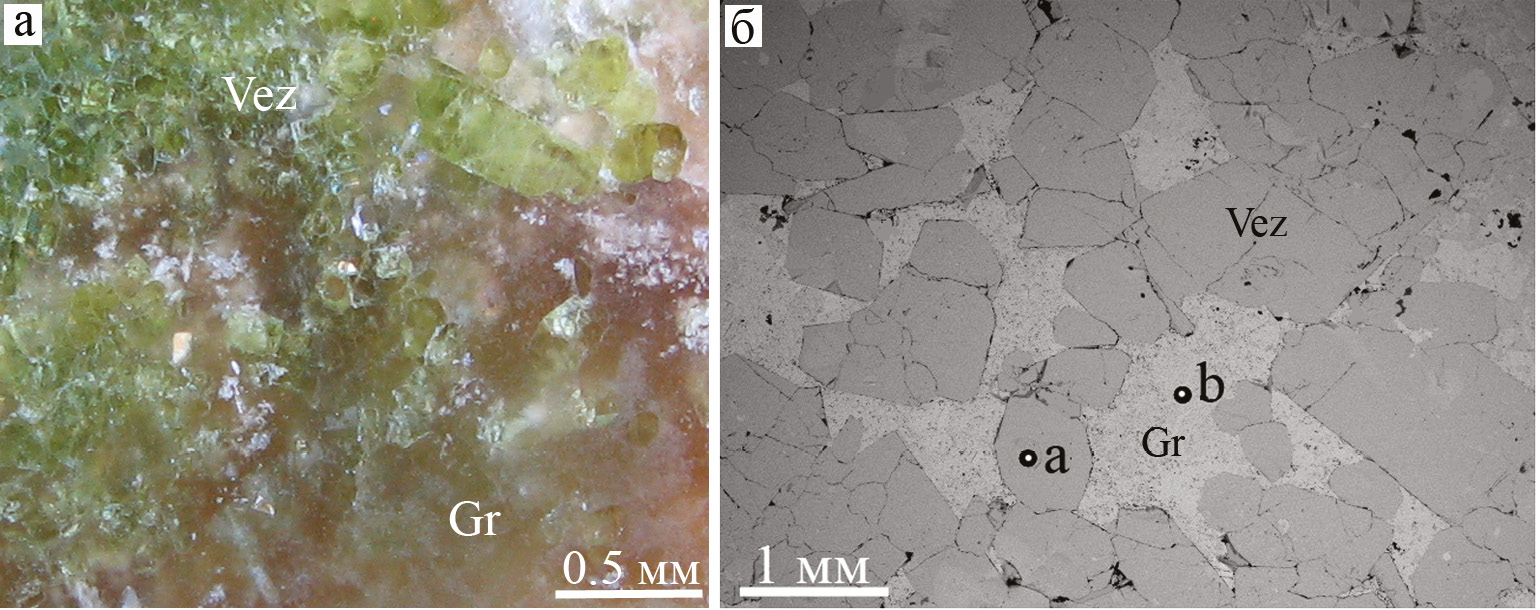 Fig. 13. Vesuvian-garnet skarn: a – polished sample, oblique light; б – structure of aggregate (a – vesuvian, b – grossular).