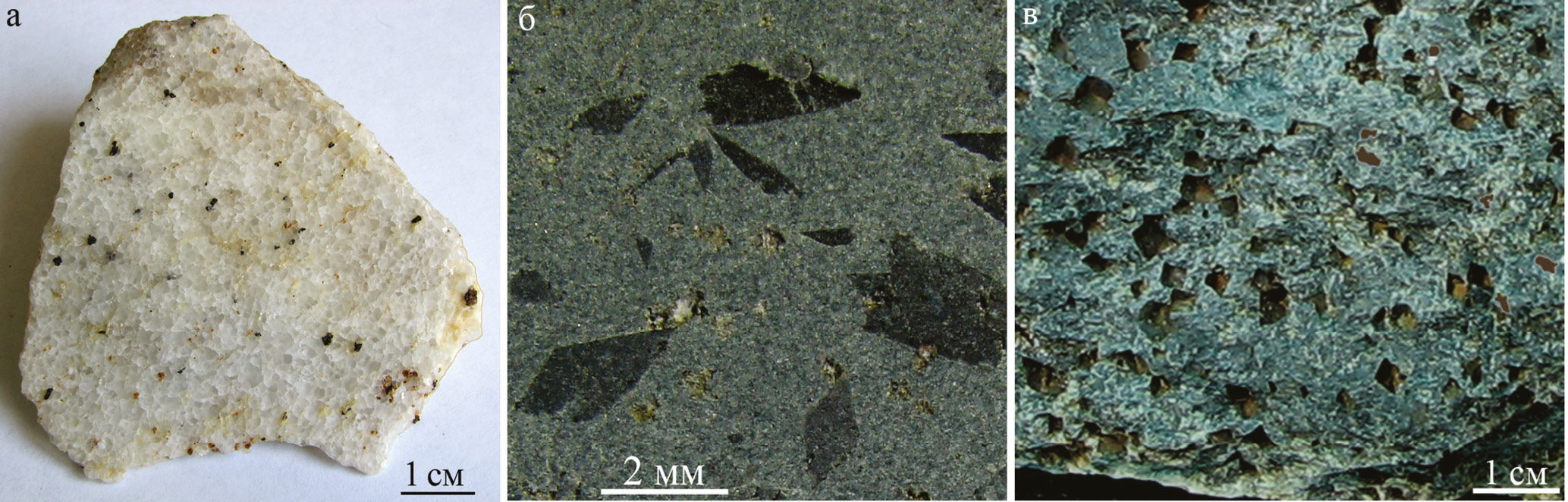 Fig. 15. Igneous rocks in area of the Shishim mine: a – calcite carbonatite; б – amphibole chloritolite; в – dolomite (rhombohedral cavities) chloritolite.