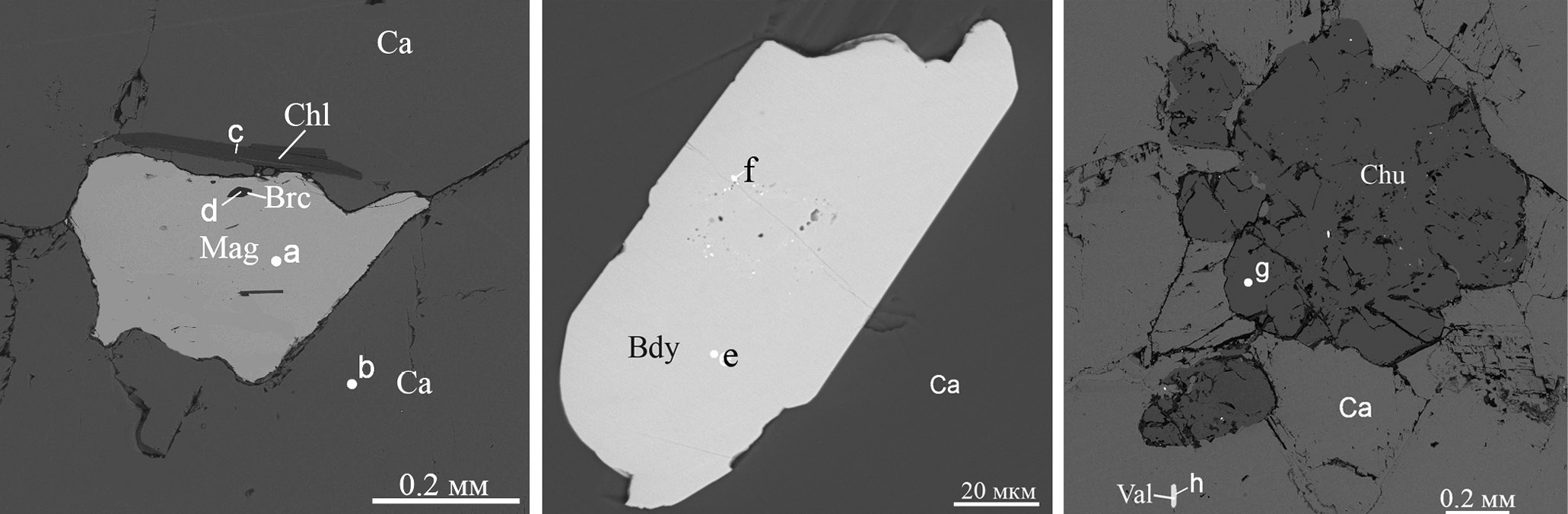 Кальцитовые карбонатиты (рис. 15а) имеют среднезернистую структуру с мелкими редкими вкраплениями второстепенных минералов – магнетита (почти магнезиоферрита), гидроксилклиногумита, клинохлора, бадделеита (часты двойники), брусита, валлериита и уранового минерала (рис. 16). Особенности состава минералов карбонатитов видны в эмпирических кристаллохимических формулах: магнетит (a) (Fe0.52Mg0.43Mn0.05)(Fe1.98Al0.01Si0.01)O4, кальцит (b) Ca0.99Mg0.01Fe0.004(CO3), клинохлор (c) Mg4.7Fe0.11Al1.16Ca0.02(Si2.82Al1.18)O10(OH)8, брусит (d) Mg0.99Fe0.01(OH1.97F0.03), бадделеит (e, табл. 2, № 12) Zr0.99Hf0.01O2, гидроксилклиногумит (g, табл. 1, № 18) Mg8.83Fe0.07Ti0.06Mn0.04(SiO4)4(OH1.66F0.34), валлериит (h) (Cu2.21Fe1.79)(Mg2.37Al0.63)S4(OH,O)6.