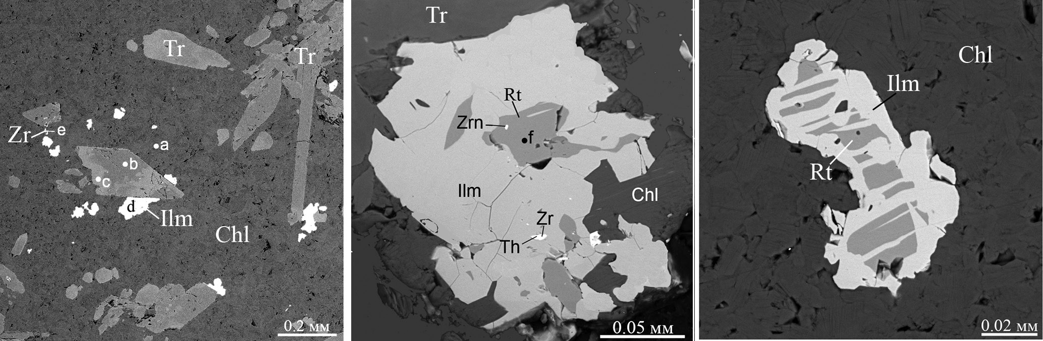 Амфиболовые хлоритолиты (рис. 15б) имеют массивную текстуру и мелкозернистую структуру плотного агрегата клинохлора с порфировыми вкрапленниками призматического тремолита. Второстепенными минералами являются кальцит, ильменит и рутил, акцессорными – циркон, цирконолит, торит, алланит (рис. 17): клинохлор (a, табл. 1, № 2) Mg3.88Fe1.18Al0.94(Si2.96Al1.04)(OH)8, тремолит (b, табл. 1, № 7) Ca2Mg4.67Fe0.33(Si7.87Al0.13)O22(OH)2, тремолит (c, табл. 1, № 8, более железистый) Ca1.9Mg4.32Fe0.78(Si7.88Al0.12)O22(OH)2, ильменит Fe0.95Mn0.03Mg0.02TiO3, циркон (е, табл. 2, № 9) Zr0.94Hf0.03Fe0.03SiO4, рутил (f) Ti0.99Fe0.01O2, кальцит (h) Ca0.99Fe0.01CO3, цирконолит (i, табл. 2, № 1, 2) Ca0.72 Zr0.96Ti1.59Fe0.49Ce0.11Nd0.07Th0.06Sm0.01O7, алланит-(Ce) (k, табл. 2, № 13) (Ca1.16Ce0.36Nd0.20La0.10 Pr0.04Mg0.14)(Al1.98Fe0.99)(SiO4)(Si2O7)O(OH). Все минералы имеют индукционные границы одновременного роста, тремолит и клинохлор зональны с более железистой периферией. Рутил с ильменитом нередко образуют синтаксические срастания. В алланите видна зональность и секториальность состава, встречаются участки ферроалланита.