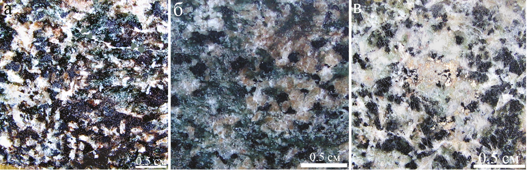 Рис. 19. Скарнированные габбро разной исходной структуры и состава: а – амфибол-плагиоклазового; б – магнетит-пироксен-плагиоклазового; в – магнетит-плагиоклаз-пироксенового?