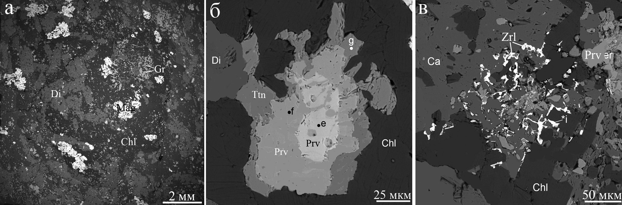 Среди образцов в отвалах копи часто встречаются скарнированные породы, теневая структура которых напоминает некоторые структуры габбро различного состава (рис. 19). Первичный минеральный состав габбро не сохранился, плагиоклазов нет совсем, светлая часть агрегата представлена бесцветным диопсидом, зеленая – клинохлором. На BSE-снимке породы (рис. 19а, 20а) видно, что диопсид Ca1.01Mg0.97Fe0.02Si2O6 образовал псевдоморфозы по плагиоклазу, клинохлор Mg4.8Al0.98Fe0.22(Si2.98Al1.02)O10(OH)8 развился преимущественно по амфиболу, скелетовидные и блочные зерна магнетита Fe0.91Mg0.06Mn0.01V0.01Fe2O4 ассоциируют с хлоритом. Эти три минерала составляют более 90 % объема породы. Преимущественно в клинохлоровой массе местами с мелким андрадитом Ca2.9Fe1.63Ti0.27Al0.12Mg0.08(SiO4)3 встречаются кальцит CaCO3, титанит Ca0.99Ti0.97Al0.02Fe0.02SiO5 и акцессорные перовскит и цирконолит (рис. 20б, в, табл. 2, № 4). В перовските видны ядро (е, табл. 4, № 8, 9) Ca0.92Ce0.03La0.01Nd0.01Y0.01Nb0.01Ta0.002Fe0.03Al0.02 W0.01Th0.01Ti0.96O3 и периферия (f) Ca0.99Fe0.01Ta0.001 TiO3. Цирконолит образует либо единичные мелкие включения в клинохлоре, либо сложные псевдоморфозы с перовскитом, титанитом и кальцитом по неизвестному минералу (рис. 20в). Форма индивидов цирконолита близка к скелетной. Под микроскопом видна характерная черта структуры: породообразующие хлорит и пироксен содержат множество мелких и мельчайших включений граната. Между всеми минералами скарна наблюдались индукционные границы одновременного роста.