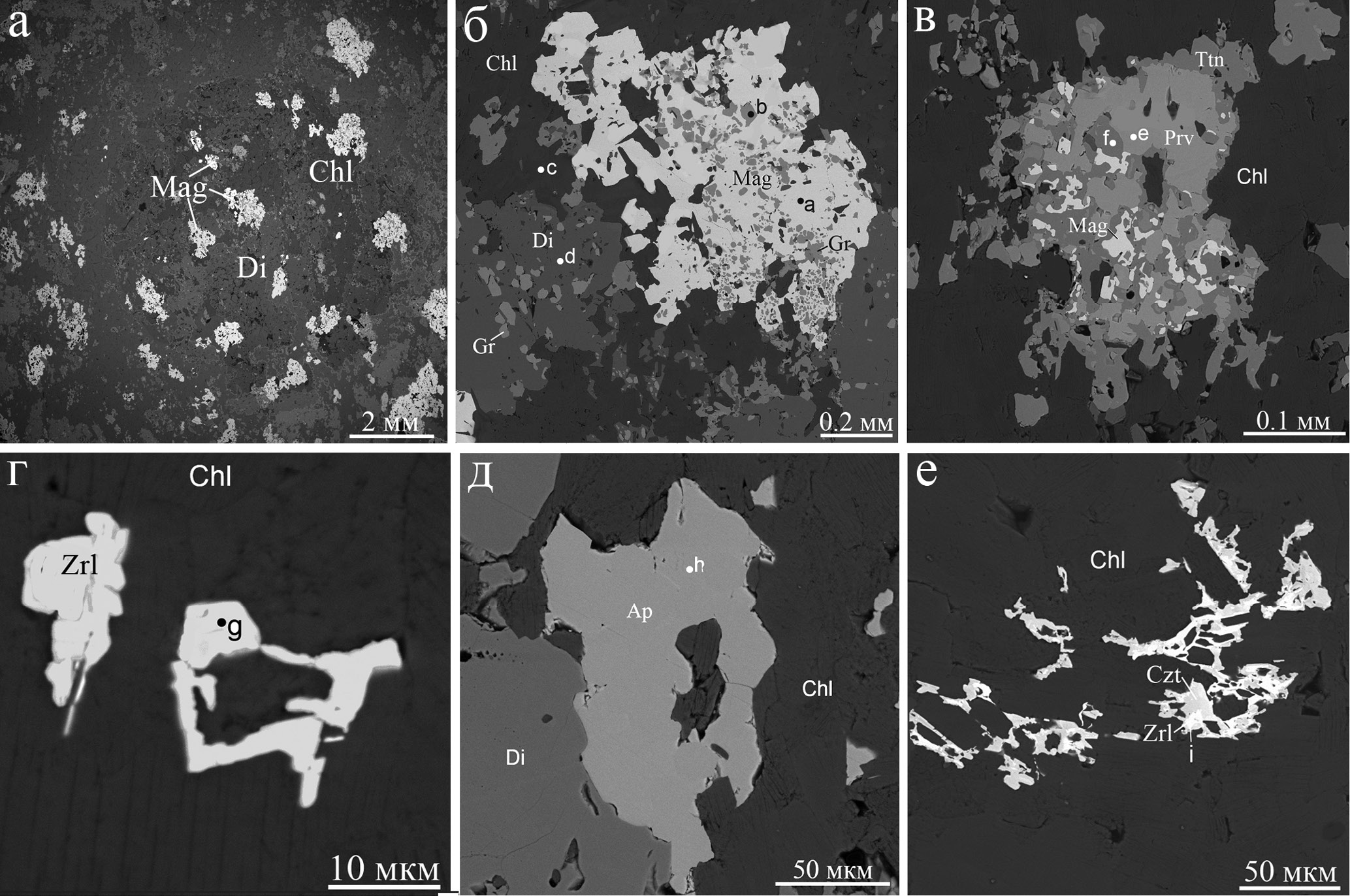 Скарн (рис. 19б) имеет много общего с предшествующей породой (рис. 19а). Преобладающими по объему минералами являются диопсид, клинохлор и магнетит (рис. 21а), в которых неравномерно вкраплен мелкий андрадит (рис. 21б). Акцессорными минералами являются перовскит, титанит, гидроксилапатит, цирконолит и кальциртит (рис. 21в–е): магнетит (a) (Fe0.93Mg0.05Mn0.02)Fe2O4, андрадит (b) Ca2.88Fe1.48Ti0.32Al0.19Mg0.13(SiO4)3, клинохлор (c) Mg4.84Al0.9Fe0.26(Si3.07Al0.93)O10(OH)8, диопсид (d) CaMg0.96Fe0.03Al0.01Si2O6, перовскит (e, табл. 4, № 10) CaTi0.99Fe0.01Y0.006Ta0.002O3, титанит (f) CaTi0.96Fe0.02Al0.02SiO5, цирконолит (g, табл. 2, № 5) (Ca0.86Y0.08Ce0.02Nd0.02)Zr0.98Hf0.001(Ti1.82Fe0.23)O7, гид-роксилапатит (h, табл. 3, № 6) Ca4.97Sr0.03(P2.9Si0.08 S0.03)O12(OH0.78F0.15Cl0.07), кальциртит (i, табл. 2, № 8) Ca2Zr4.84Ti2.06Fe0.05Hf0.05O16. Все минералы имеют индукционные границы друг с другом. Кальциртит и цирконолит скелетовидны и встречаются в клинохлоре. Иногда они образуют срастания друг с другом (синхронны! – рис. 21е). Явных псевдоморфоз в скарновом агрегате не видно, но кучное размещение некоторых минералов (например, магнетита) подчеркивают «тени» предшествующей структуры породы (габбро).