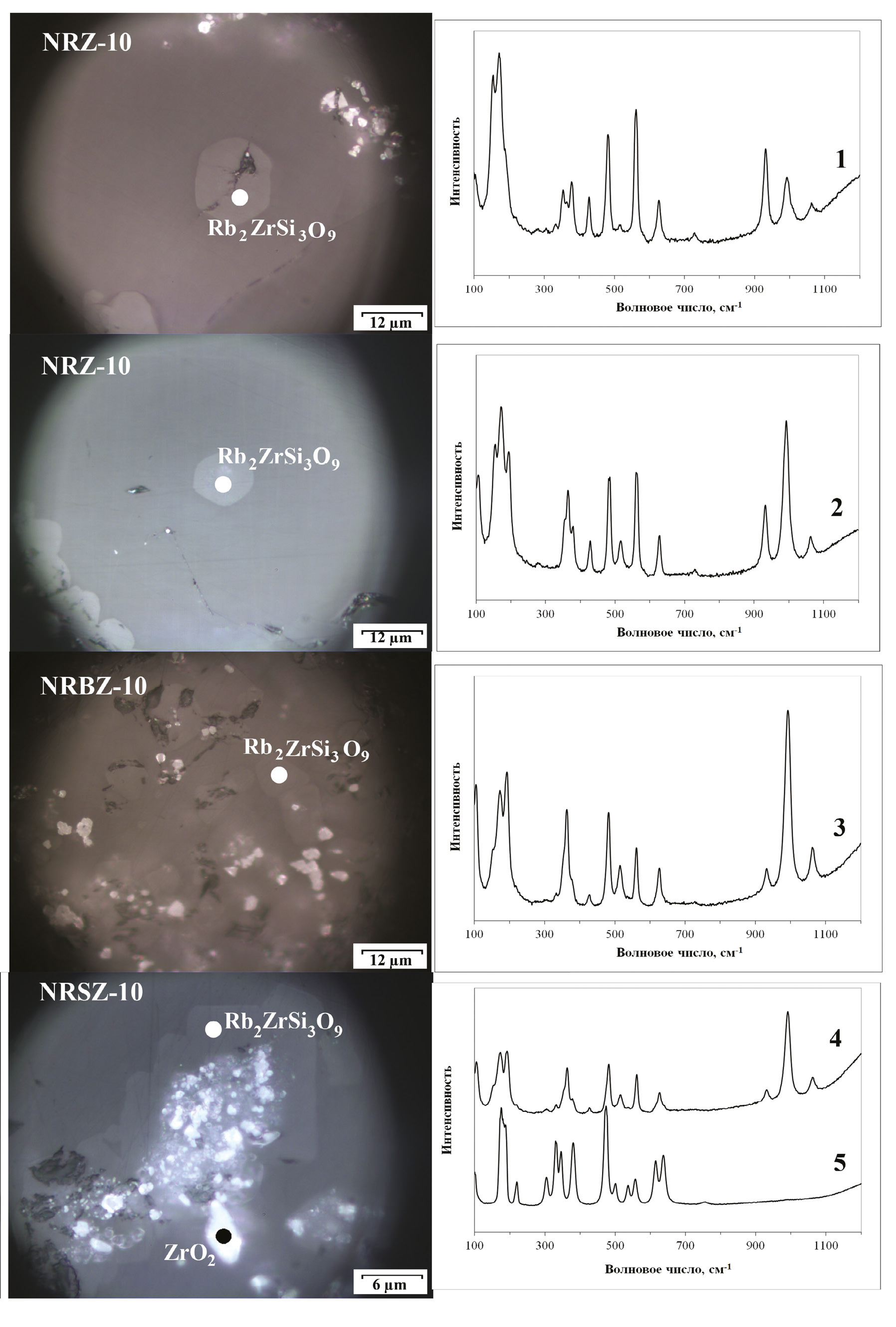 На дифрактограммах всех образцов в области 2θ = 23–33° присутствует невысокое широкое «гало», характерное для стекол, полученных быстрым охлаждением расплава (рис. 4). Форма данного «гало» и положение его максимума на дифрактограммах одинаковы для всех образцов, что отражает их близкий химический состав и подобие структуры. На всех дифрактограммах доминируют отражения, характерные для кристаллов, изоструктурных с K2ZrSi3O9 (Kyono, Kimata, 2001). Параметры гексагональной элементарной ячейки изученных кристаллов а0 = 7.0502(7), с0 = 10.2093(18), Vc = 439.47(8)). Данный набор отражений соответствует фазе Rb2ZrSi3O9 (цирконосиликат Rb). Зафиксированы также отражения, соответствующие ZrO2 (бадделеит) (Lafuente et al, 2015). Отсутствие на дифрактограмме образца NRSZ-10 отражений, характерных для рубидиевого микроклина RbAlSi3O8 (Lafuente et al, 2015; Kyono, Kimata, 2001), указывает на незначительное присутствие данной кристаллической фазы в исследуемом образце, которое установлено только методом электронной микроскопии (рис. 2).
