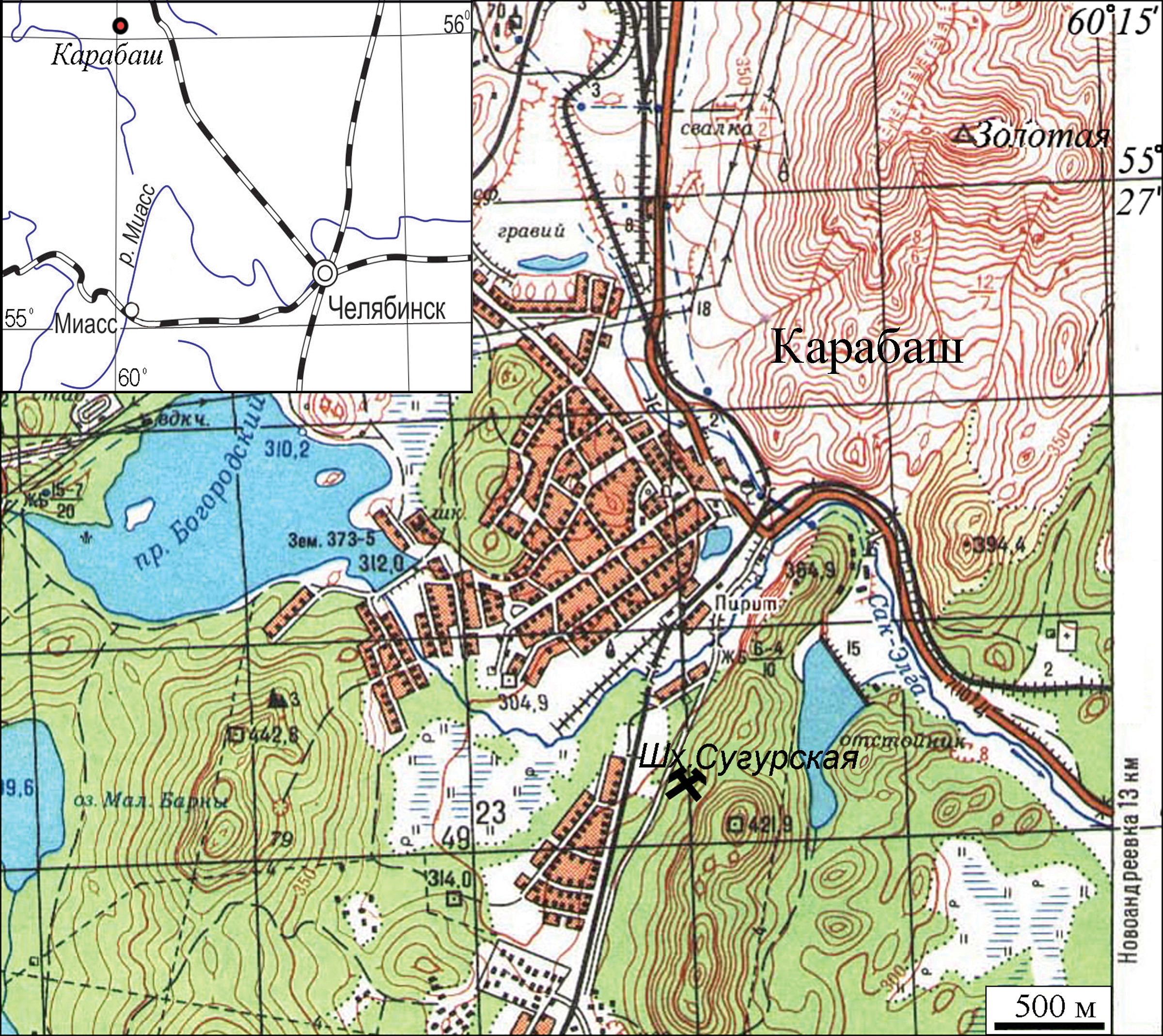 Рис. 1. Географическое положение Сугурской шахты в южной части города Карабаш.