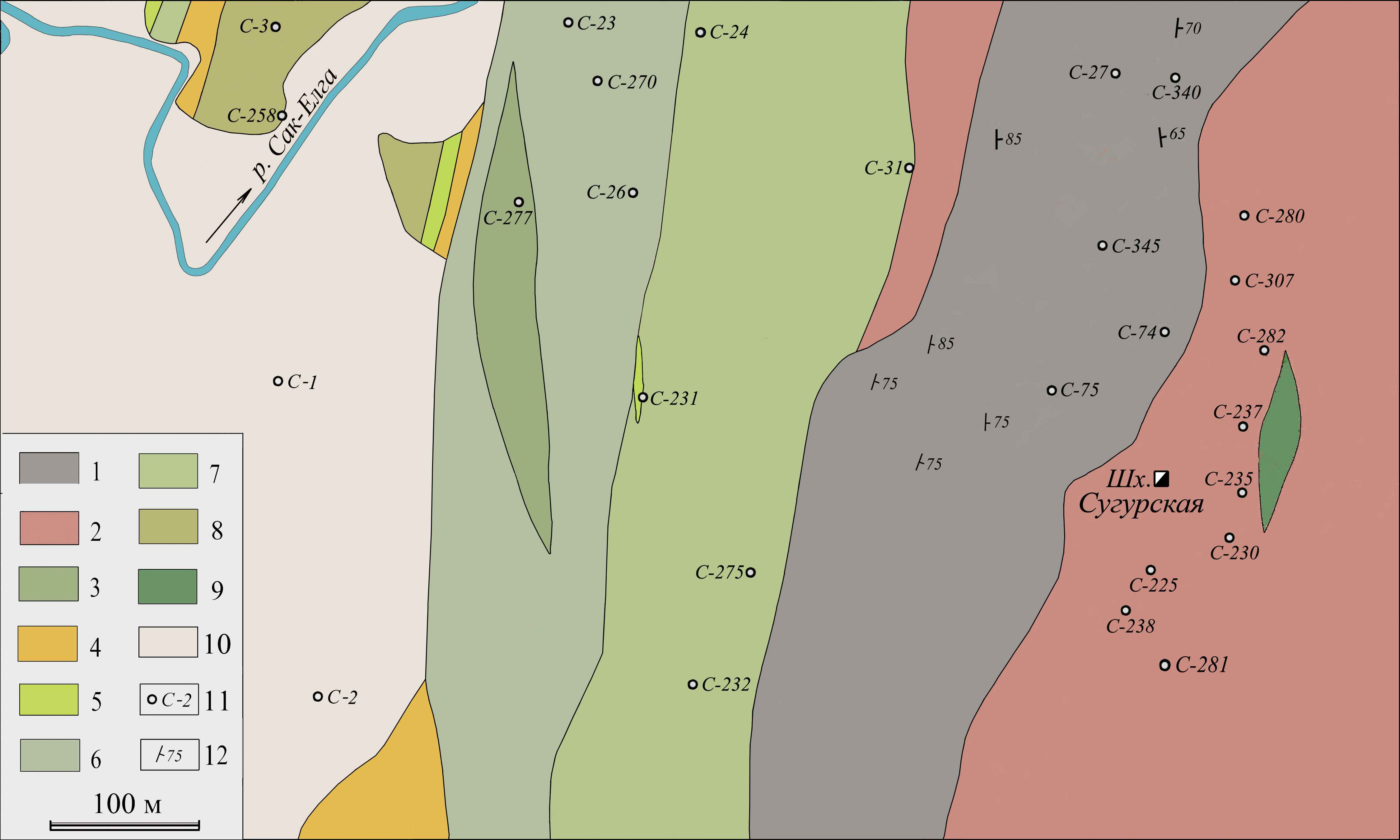 4. Fig. 3. Geological scheme of the Sugur deposit, modified after (Maliy, 1940ф). 1 – limestone; 2 – serpentine; 3 – porphyritic rocks; 4–8 – schist: quartz-sericite (4), quartz-chlorite-sericite (5), quartz-sericite-chlorite (6), quartz-chlorite (7), quartz-chlorite-epidote (8); 9 – diorite; 10 – Quaternary sediments; 11 – borehole numbers; 12 – bedding elements.