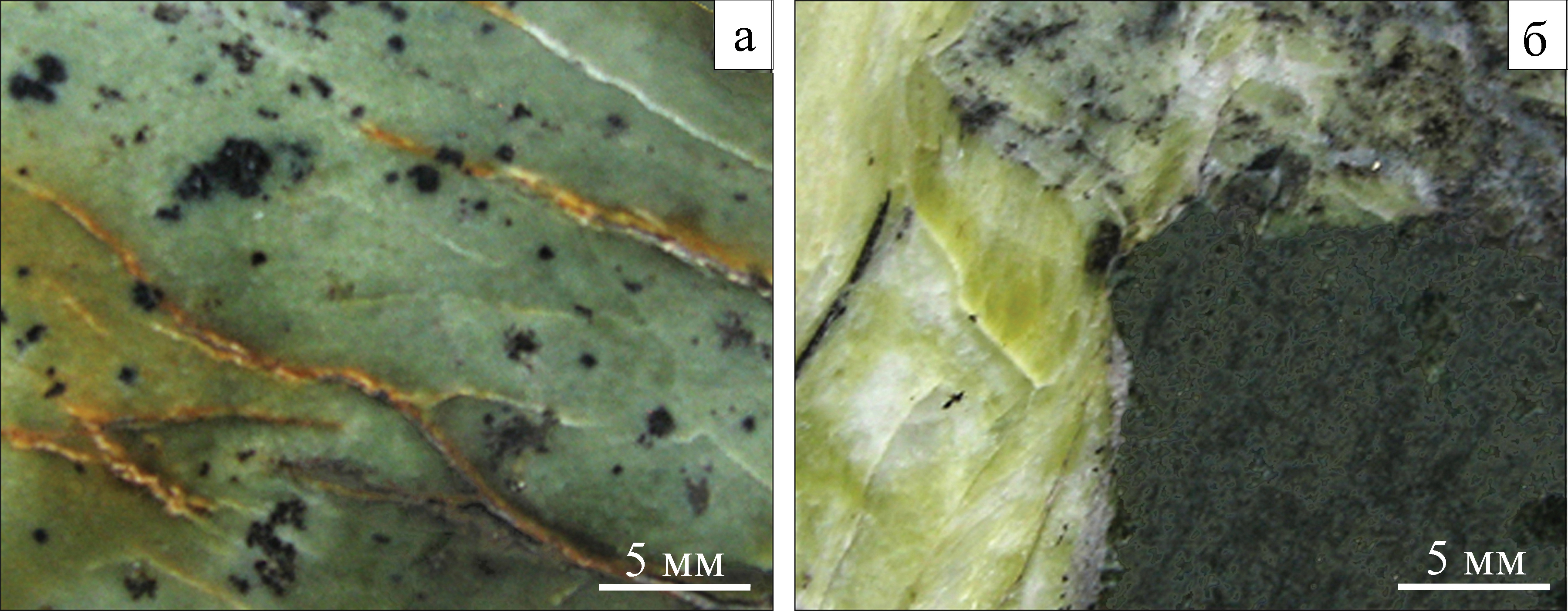 Рис. 6. Серпентинит с хромитом, частично замещенным магнетитом (а); хризотил-асбест (желто-зеленый) с кальцитом в полости деформационного отслоения среди серпентинита (б).