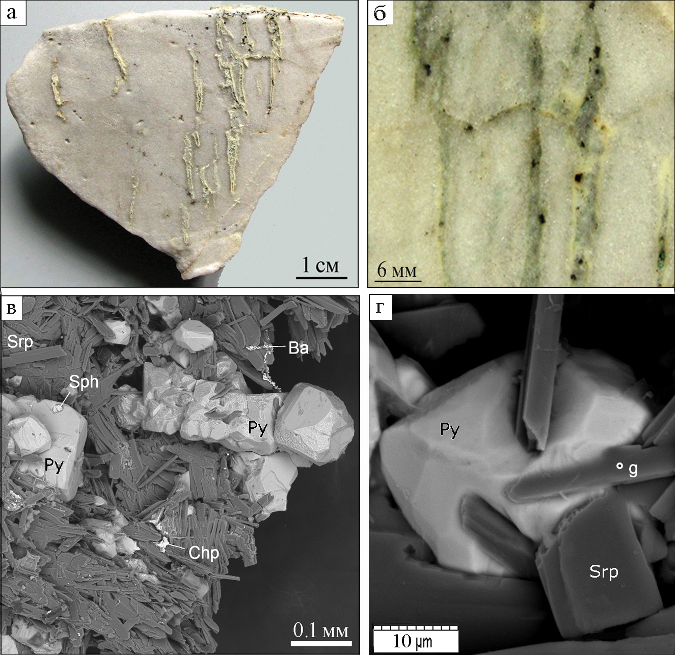 Рис. 7. Кальцитовые карбонатиты с сульфидно-кальцит-серпентиновыми (а, б) и кальцит-пирит-сфалерит-антигоритовыми прожилками с халькопиритом и баритом (в); г – пирит (Py) с вростками антигорита (Srp).