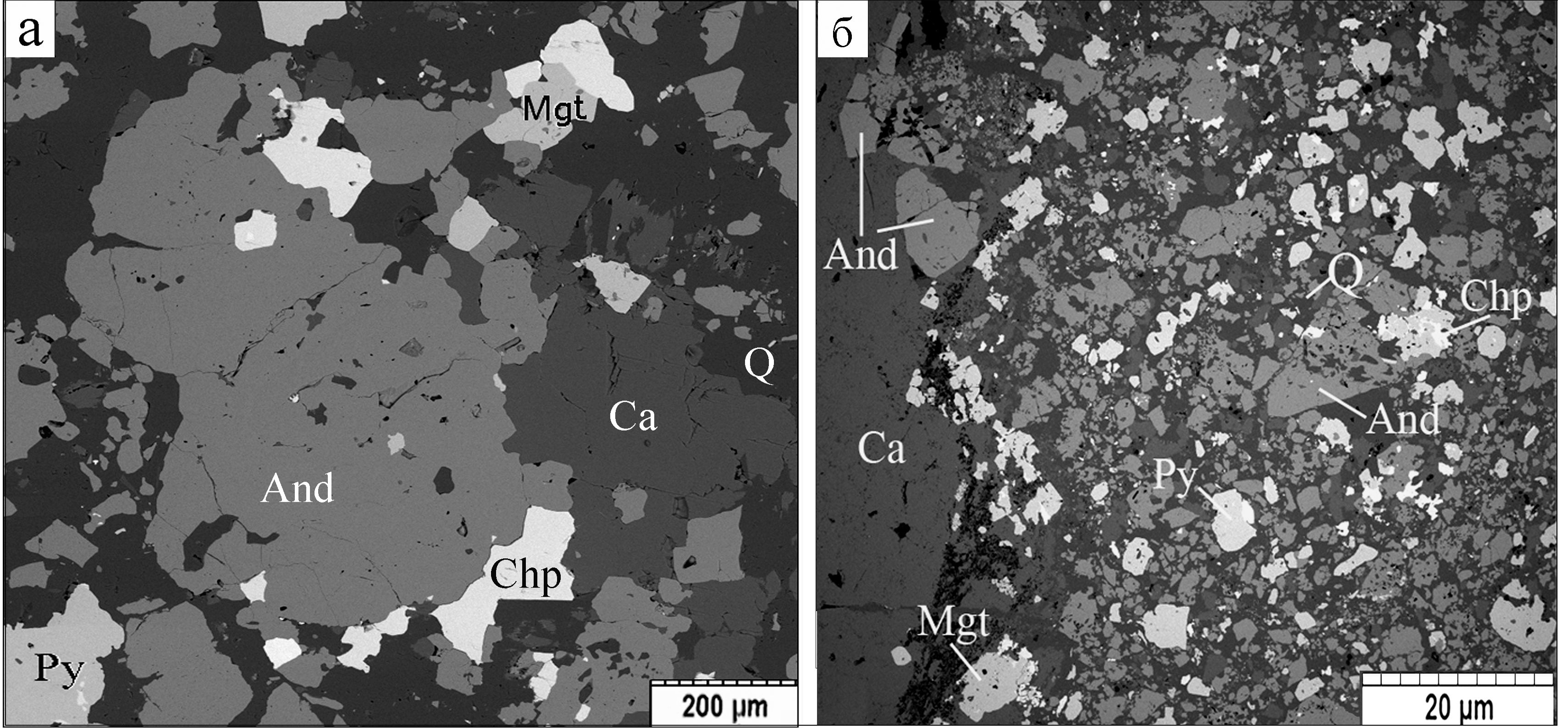 Рис. 9. Скарны неравнозернистой структуры (а, б) с признаками сокристаллизации андрадита (And) с кальцитом (Ca), кварцем (Q), халькопиритом (Chp), пиритом (Py) и магнетитом (Mgt).