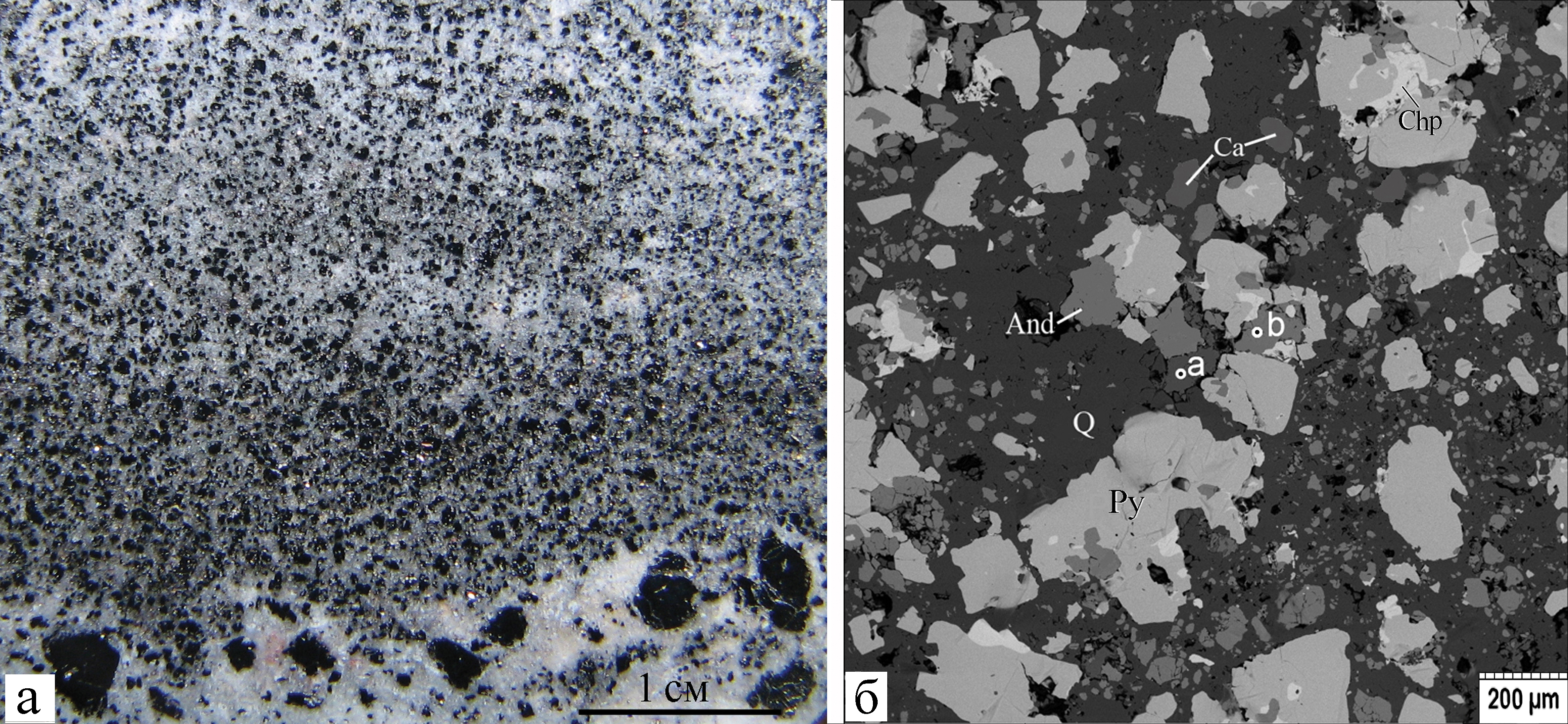 Рис. 10. Мелкозернистый скарн (а) и его структура (б) с пиритом (Py), кварцем (Q), кальцитом (Ca), халькопиритом (Chp) и андрадитом (And).