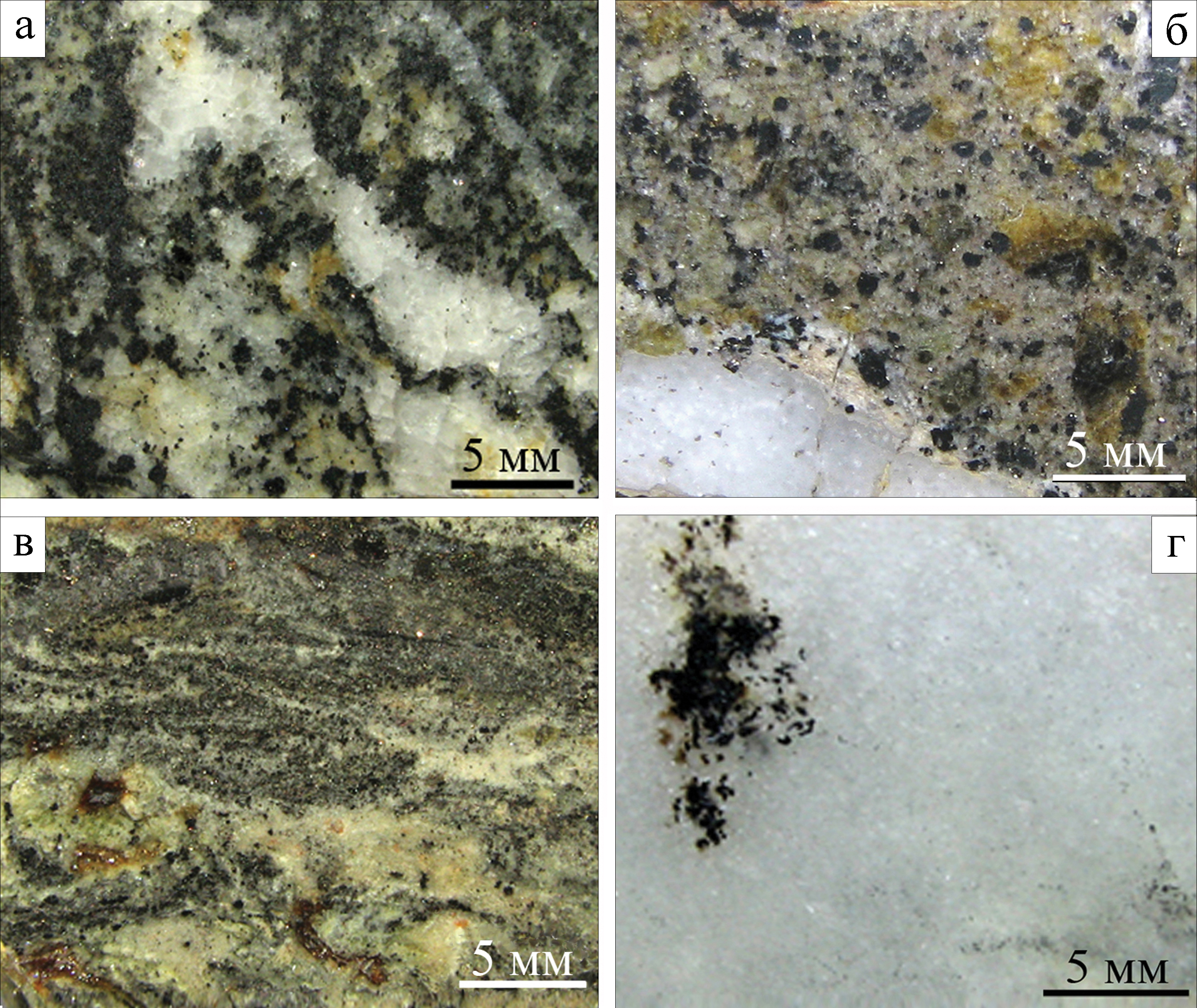 а – magnetite-calcite; б – magnetite-andradite-calcite; в – pyrite-magnetite-calcite; г – marble-like magnetite-serpentine-calcite.