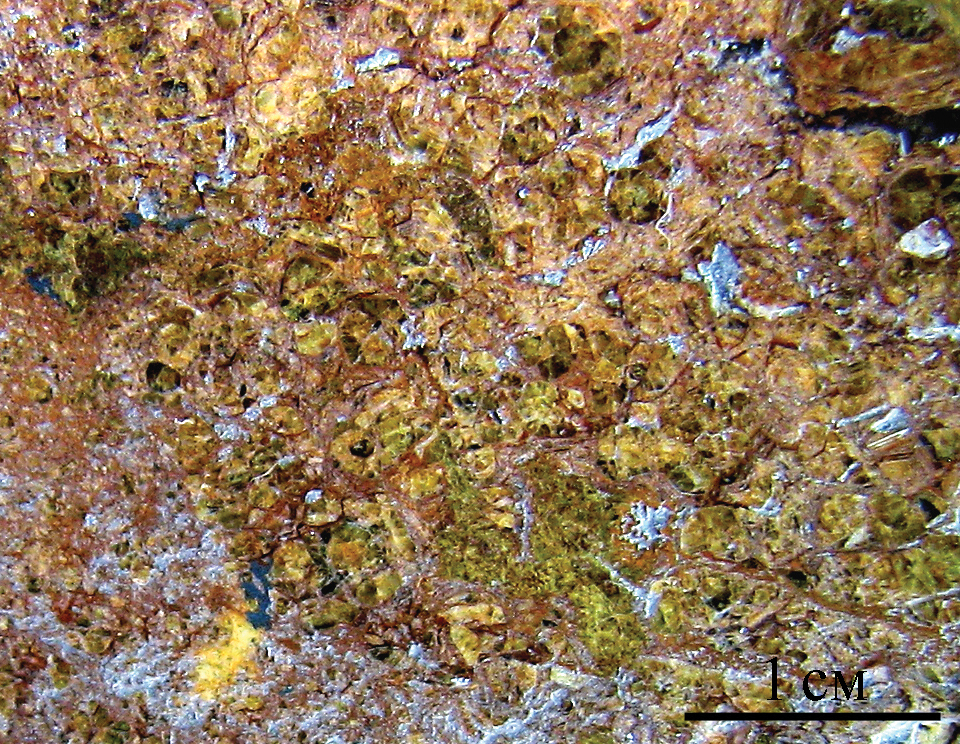 13. Fig. 12. Garnet «sand»: andradite (light green) in porous limonite (yellow-brown) with quartz and gypsum in cavities (light gray).