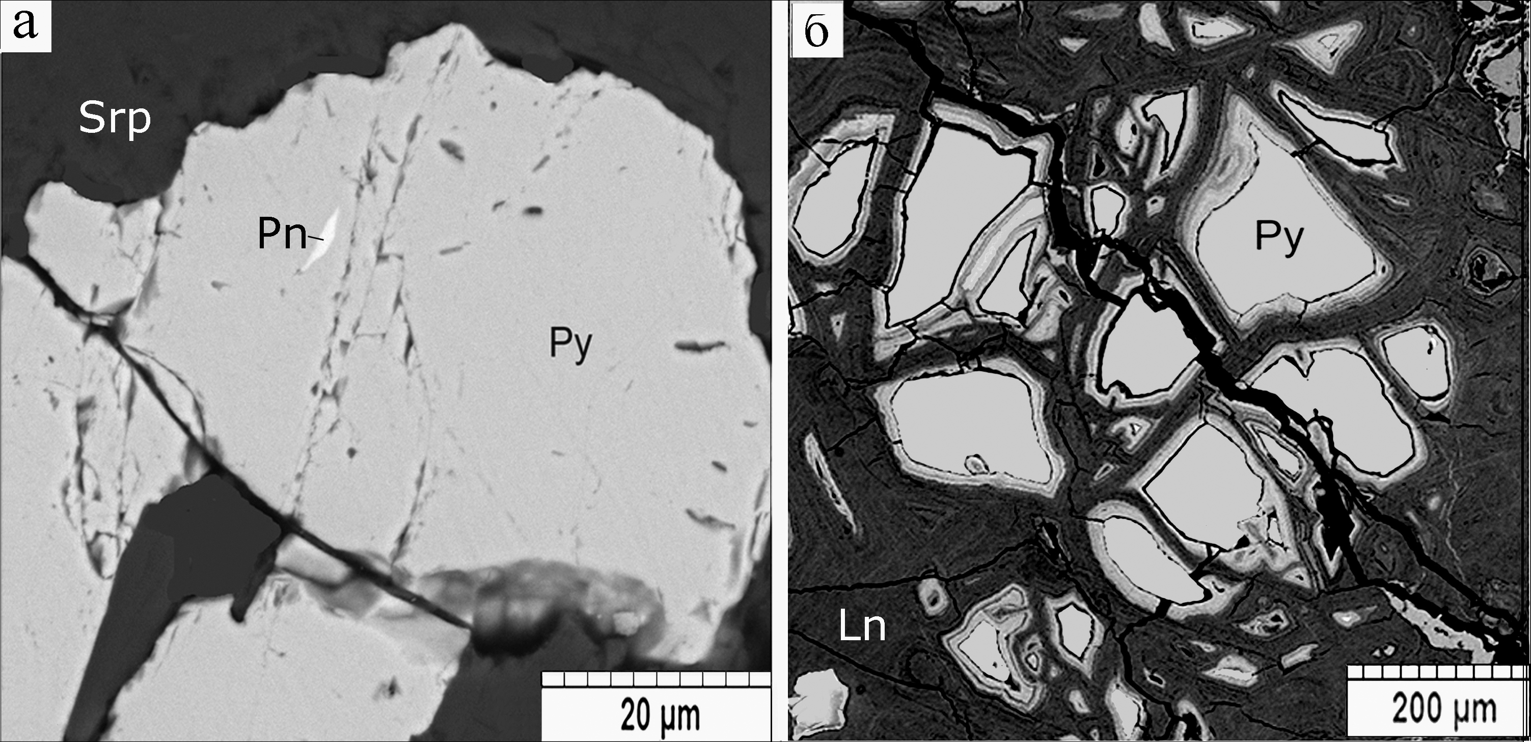 Рис. 13. Кобальтистый пирит (Py) с вростком пентландита (Pn) в серпентините (а) и зональные псевдоморфозы лимонита (Ln) по пириту (Py) (б).