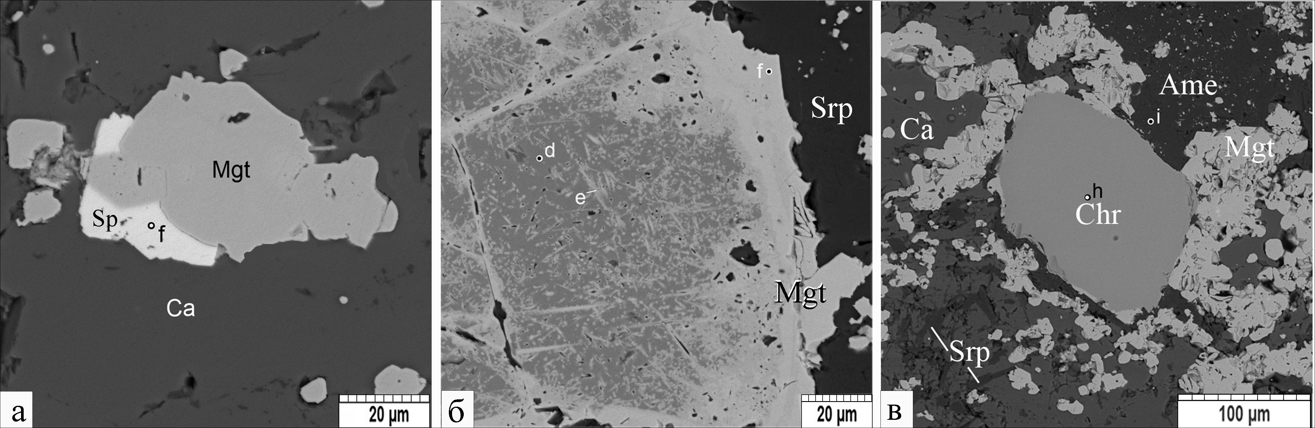 Fig. 14. Aggregate of magnetite (Mgt), sphalerite (Sp) and calcite (Ca) (а); partial pseudomorphosis of magnetite (e, f) after chromite (d) (б); chromite (Chr) in magnetite-calcite aggregate with serpentine (Srp) and amesite (Ame) (в).