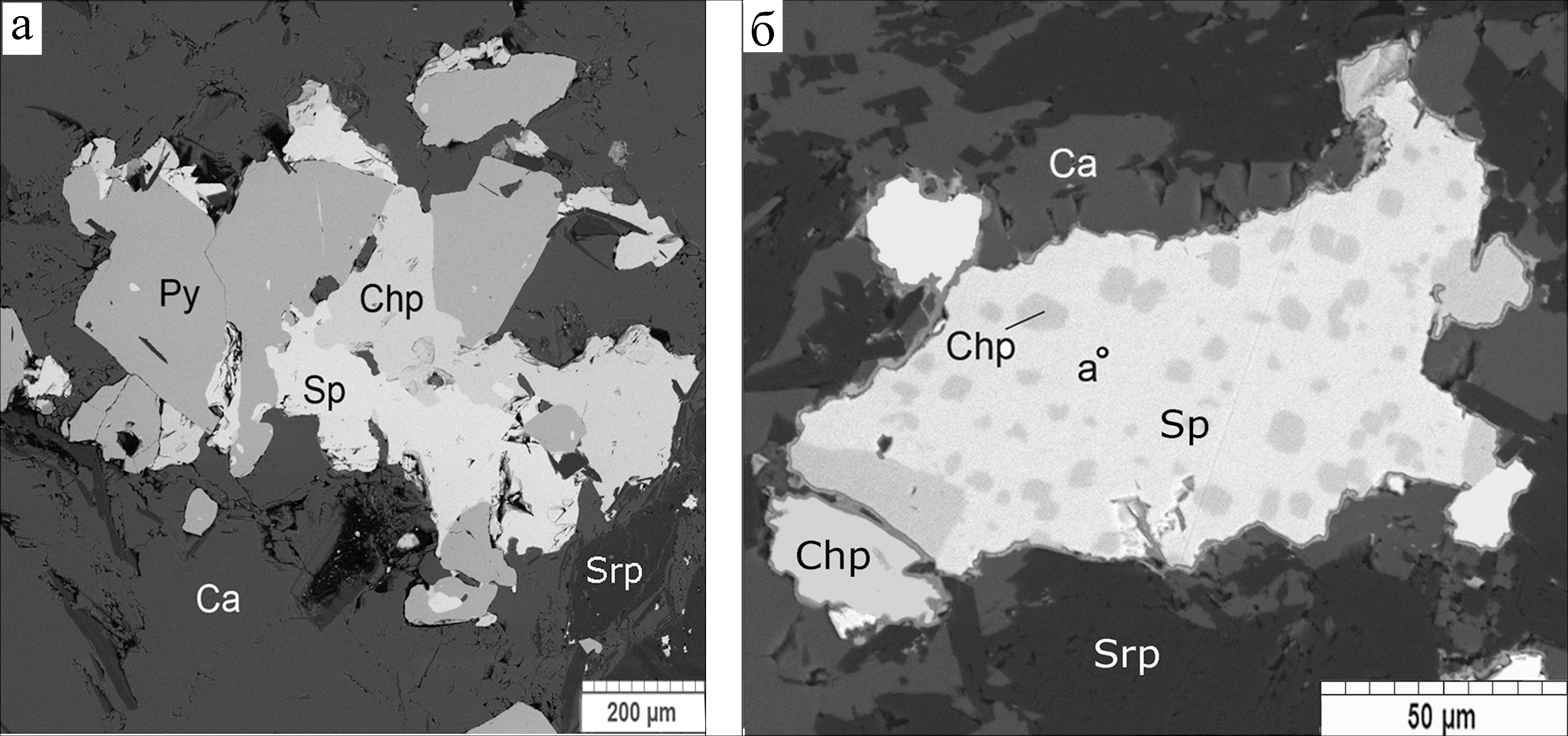 Рис. 15. Парагенезис сфалерита (Sp), халькопирита (Chp) и пирита (Py) с кальцитом (Ca) в серпентинсодержащем карбонатите (а); синтаксическое срастание сфалерита с халькопиритом в карбонатите с серпентином (Srp) (б).