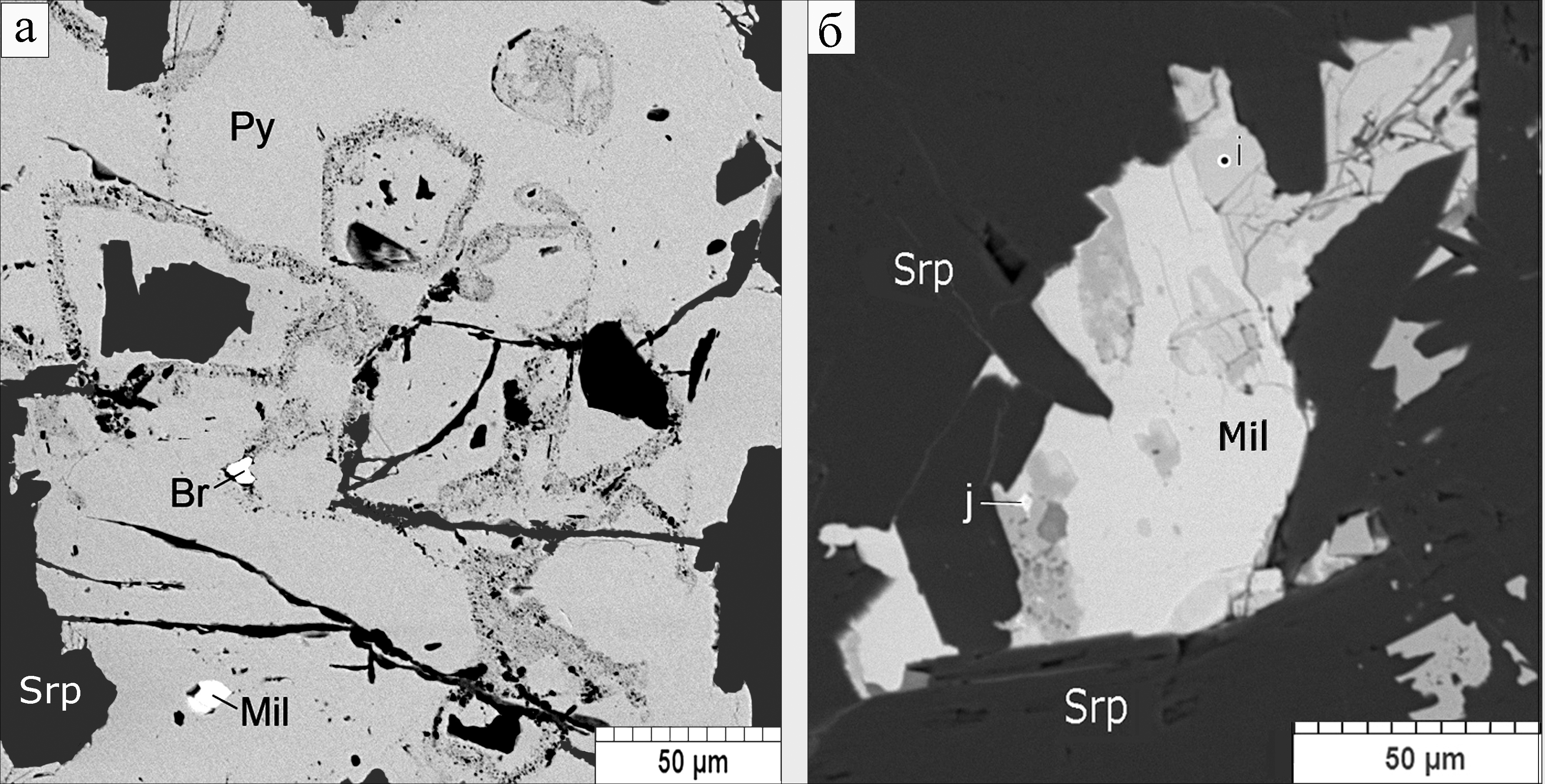 Fig. 16. Inclusions of millerite (Mil) and baryte (Br) in pyrite (Py) with zones of serpentinite microinclusions (Srp) (а); aggregate of millerite, pentlandite (i) and Fe-Ni As-bearing sulfide (j) (б).
