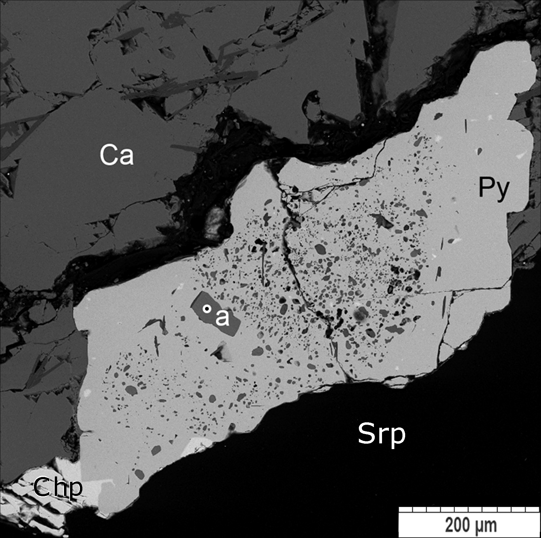 Fig. 18. Anhydrite (a, small inclusions) and chalcopyrite (Cpy) in pyrite (Py) from serpentine-calcite carbonatite (Ca-Srp).