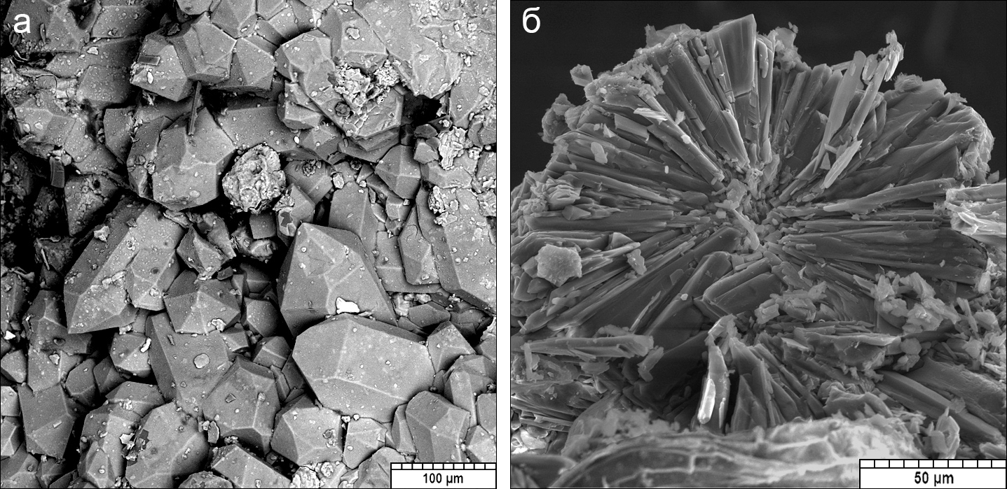 а – экзогенный кварц с присыпкой гипса и глины из полости трещины в «сыпучке»; б – сферолит гипса.
