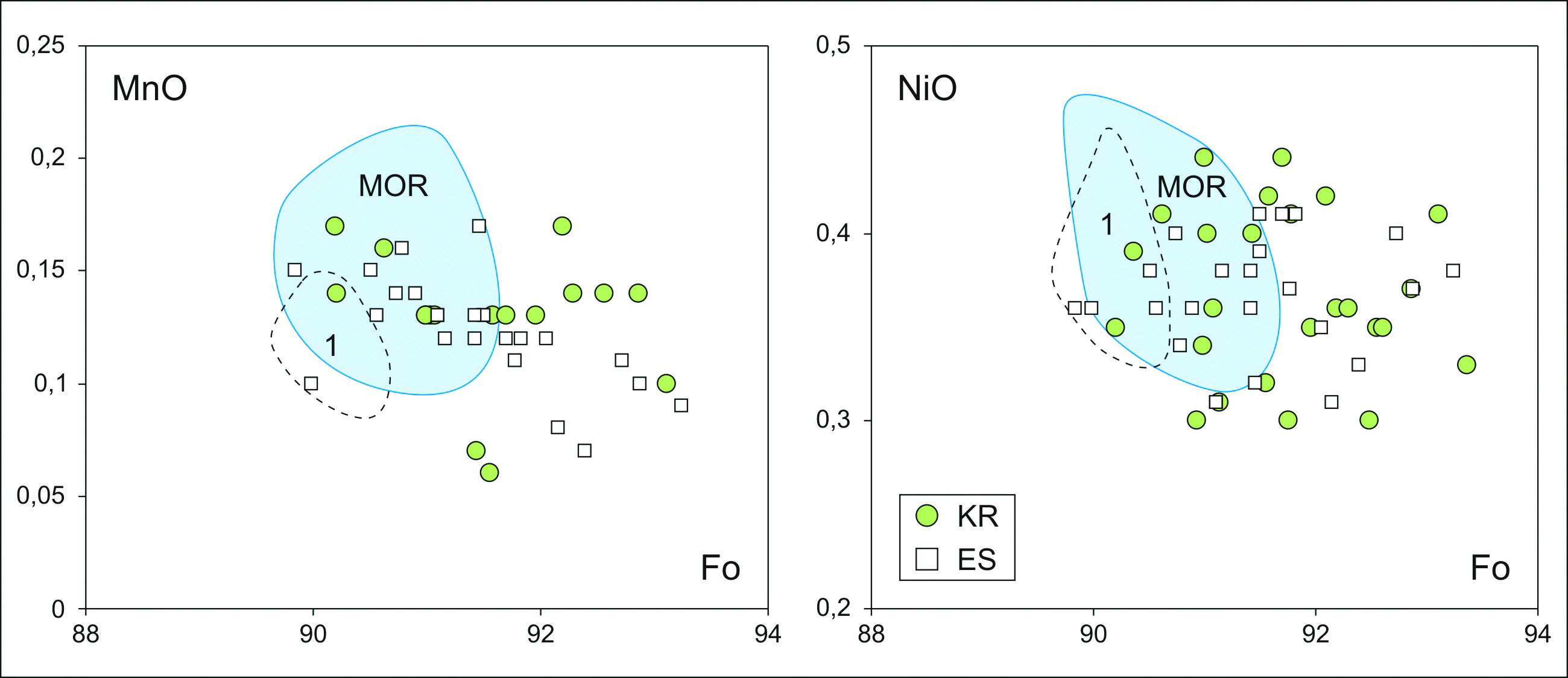 Оливины из дунитов и гарцбургитов на диаграммах MnO–Fo и NiO–Fo частично располагаются в поле минералов из гарцбургитов СрединноАтлантического хребта (САХ), также как и оливины из ультрабазитов Чаган-Узунского массива (Горный Алтай) и Оспинского массива (Восточный Саян). Оливины с повышенными значениями форстеритового компонента отличаются от океанических минералов, полностью совпадая с данными по минералам Восточного Саяна (рис. 3). В целом, видны общие черты рассмотренных офиолитов, которые содержат оливины с океаническими характеристиками.