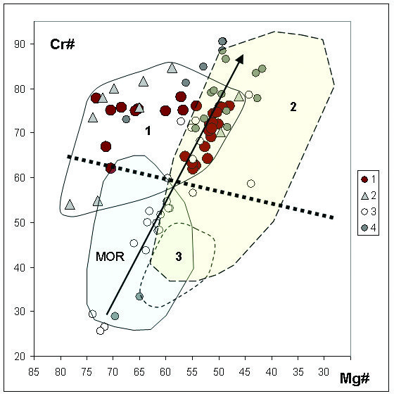 Хромшпинелиды на диаграмме Cr#–Mg# отчетливо разбиваются на две группы. В состав первой (№ 1 на рис. 4) входят хромиты с расплавными включениями и минералы из хромититов, образующие изометричное поле с повышенными значениями хромистости и магнезиальности. Для другой группы характерен прямолинейный тренд роста значений Cr# на фоне падения значений Mg# и переходом от океанических характеристик к островодужным. В начале тренда располагаются, в основном, хромшпинелиды из гарцбургитов, а в конце – преобладают более хромистые и менее магнезиальные хромиты из дунитов (рис. 4).
