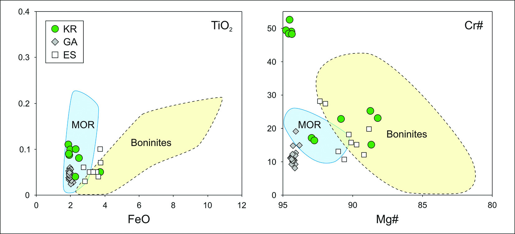 Клинопироксены по соотношению миналов (En-Wo-Fs) принадлежат к диопсиду. На диаграмме TiO2–FeO они располагаются в поле клинопироксенов из ультраосновных пород САХ (рис. 6). По соотношению Cr#–Mg# клинопироксены также разбиваются на две группы, и наблюдается переход от океанических характеристик к островодужным (рис. 6). Повышенными значениями хромистости обладают клинопироксены, формирующие микрокристаллы в хромшпинелидах, в отличие от пироксенов из основной массы ультрабазитов.