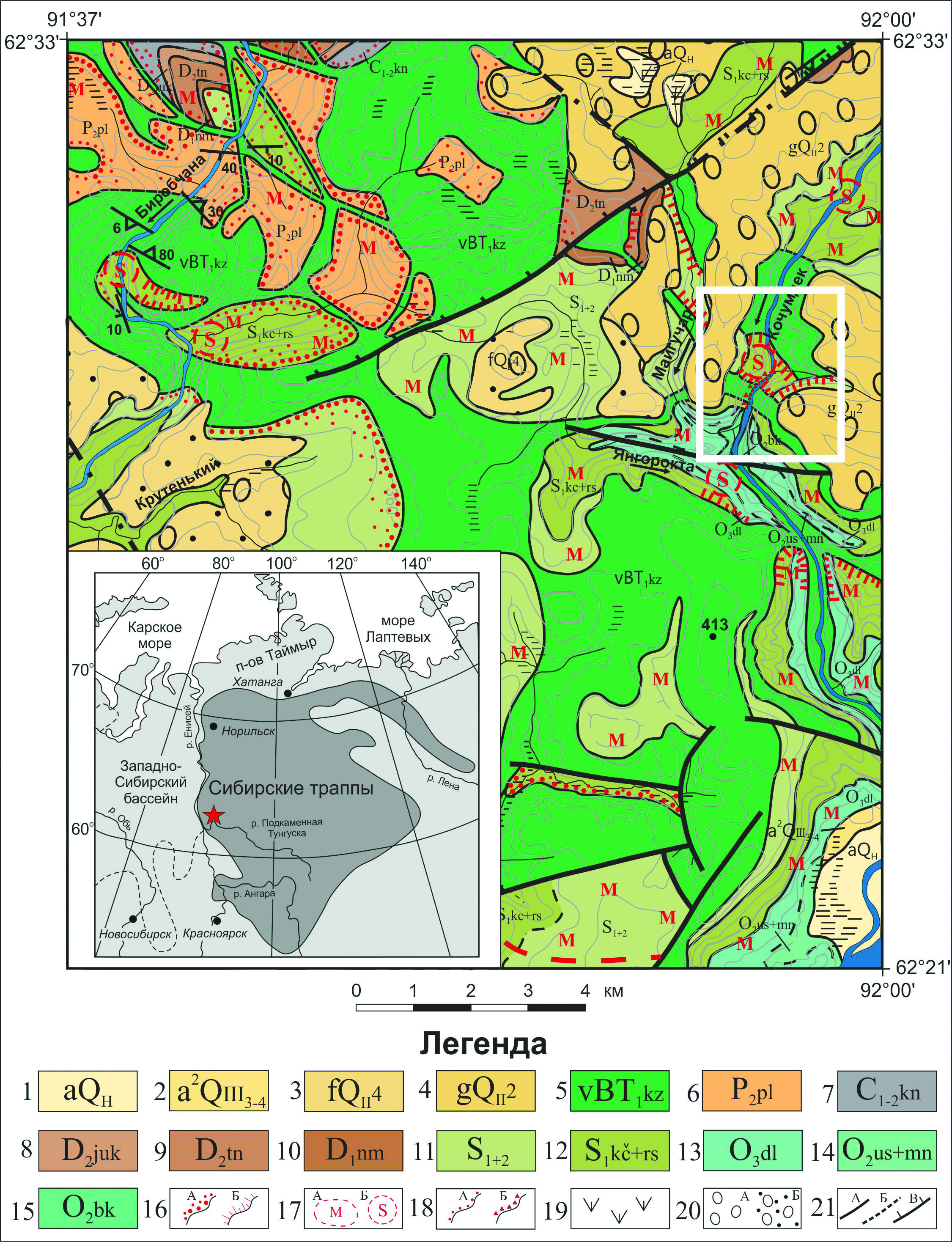 Fig. 1. Area of occurrence of Siberian traps after (Egorova, Latypov, 2013) and geological map of the studied area (red star and white square) modified after State Geological Map on a scale of 1: 200 000 (Poryadin et al., 1977). Legend corresponds to the State Geological Map on a scale of 1:1 000 000.