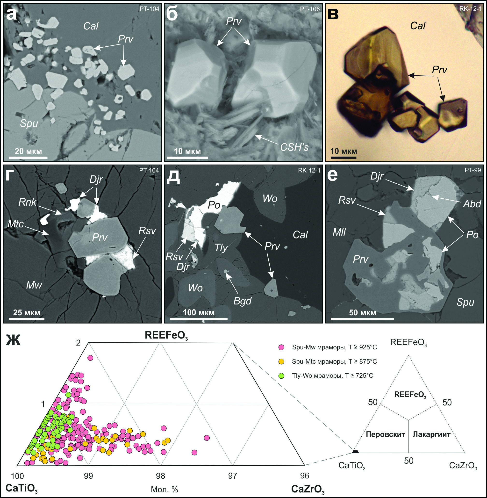 Fig. 3. Peculiarities of morphology and chemical composition of perovskite from marbles of the Kochumdek contact aureole:а–в – small pseudo-octahedral perovskite crystals; г, д – perovskite crystals in assemblage with K-Fe sulfides (г) and small baghdadite grains (д); е – poikilitic perovskite crystal with sulfide inclusions; ж – composition of perovskites (mol. %) on CaTiO3–REEFeO3–CaZrO3 diagram.