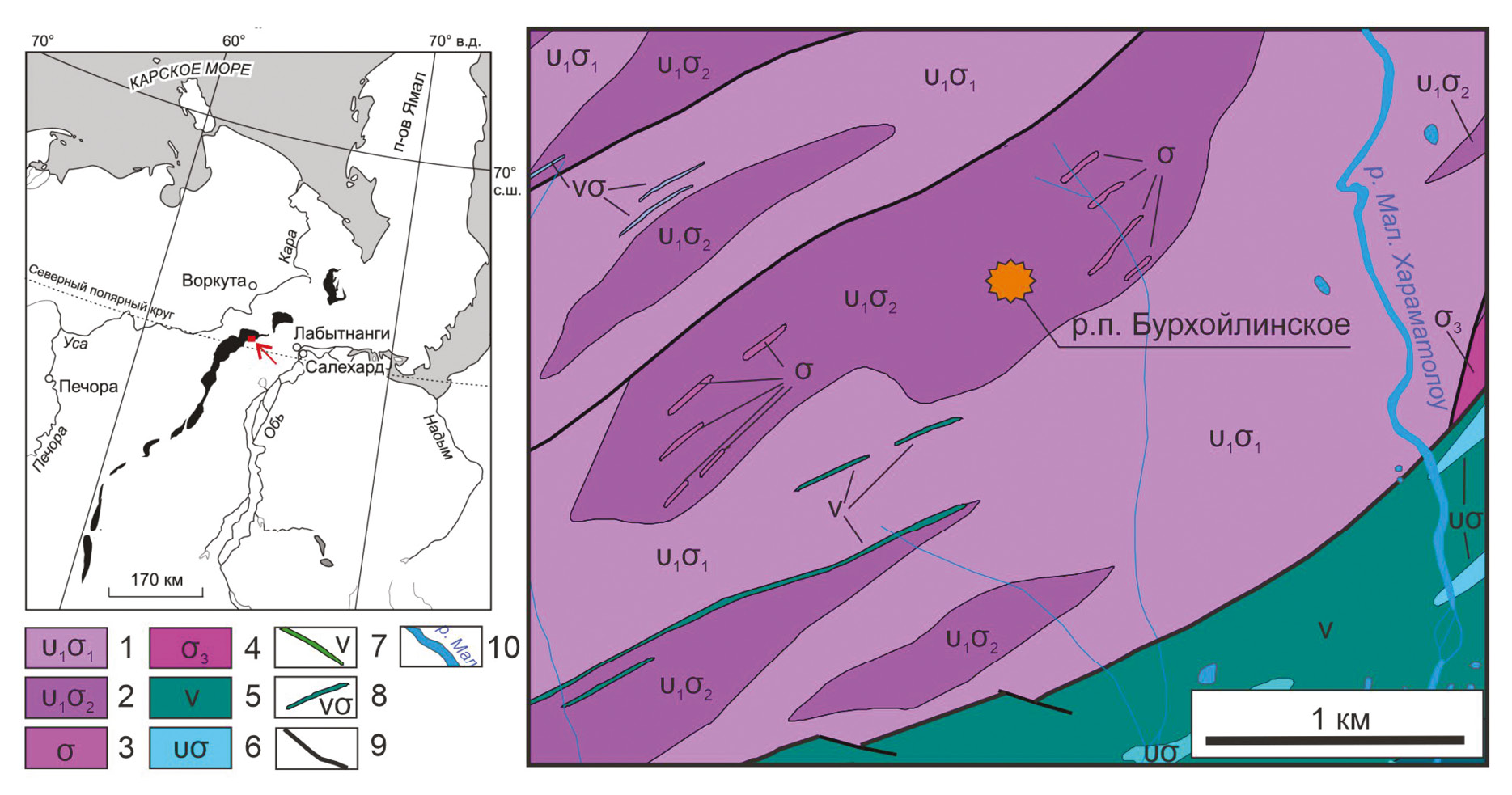 Fig. 1. Geological scheme of the Burkhoyla area of the Voykar-Synya massif (Polar Urals), after (Ivanovsky, Ovechkin, 1999; Savelyeva et al., 2015).