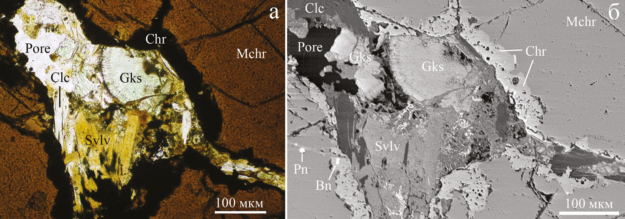 Здесь и на рис. 5, Gks – глаукосферит, Chr – хромит, Mchr – магнезиохромит, Svlv – савельеваит, Clc – клинохлор, Pn – пентландит, Bn – борнит, Pore – открытое пространство полости.